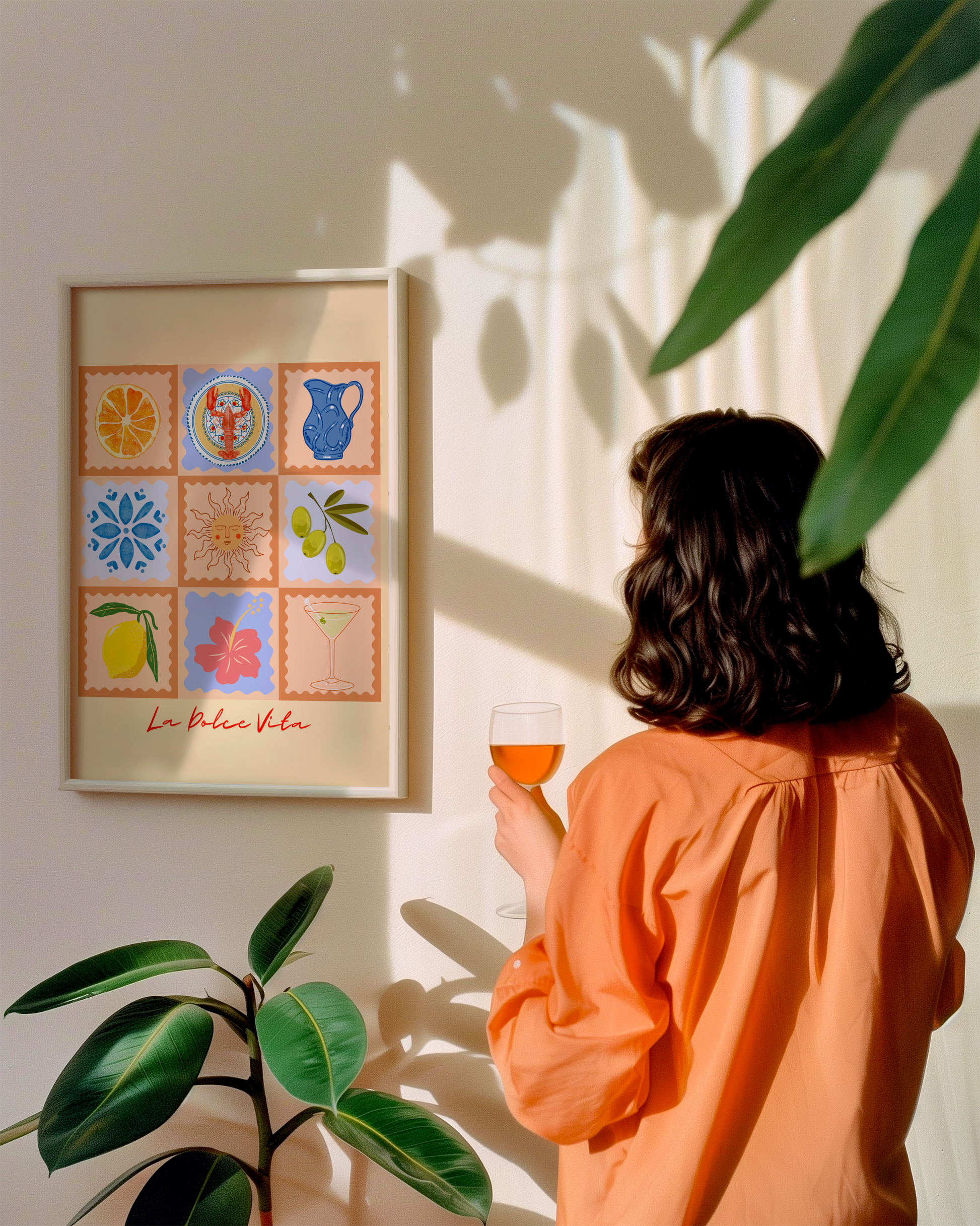 Experience the essence of a 'La Dolce Vita' summer with this modern, Italian-inspired poster print. The design features a patchwork pattern of squares with wavy borders, each filled with summer-themed illustrations. The gentle and appealing colour palette of buttery yellow, orange, blue, and red will add a vibrant touch of summer to your interior decor.