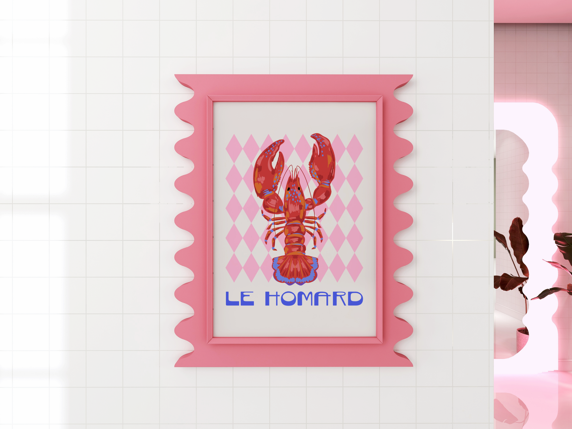 Add a bold splash of coastal French charm to your home with this striking ‘Le Homard’ poster print. Featuring a vibrant red illustrated lobster set against a fun pink diamond pattern and finished with the phrase Le Homard in stylish blue typography, this print brings playful personality and nautical flair to any space.