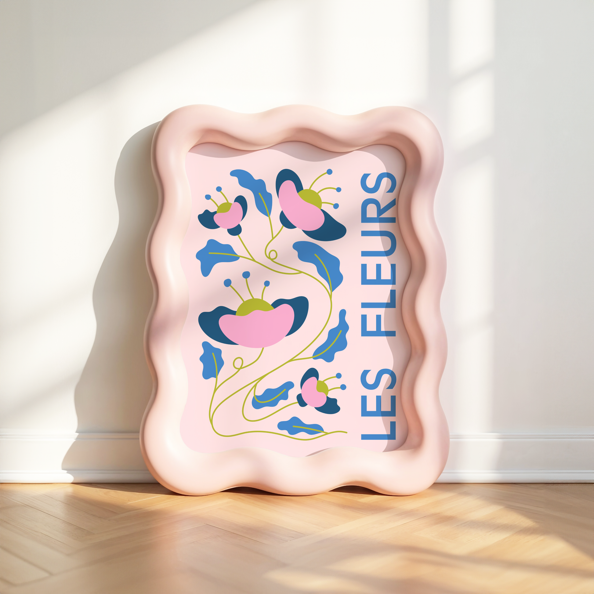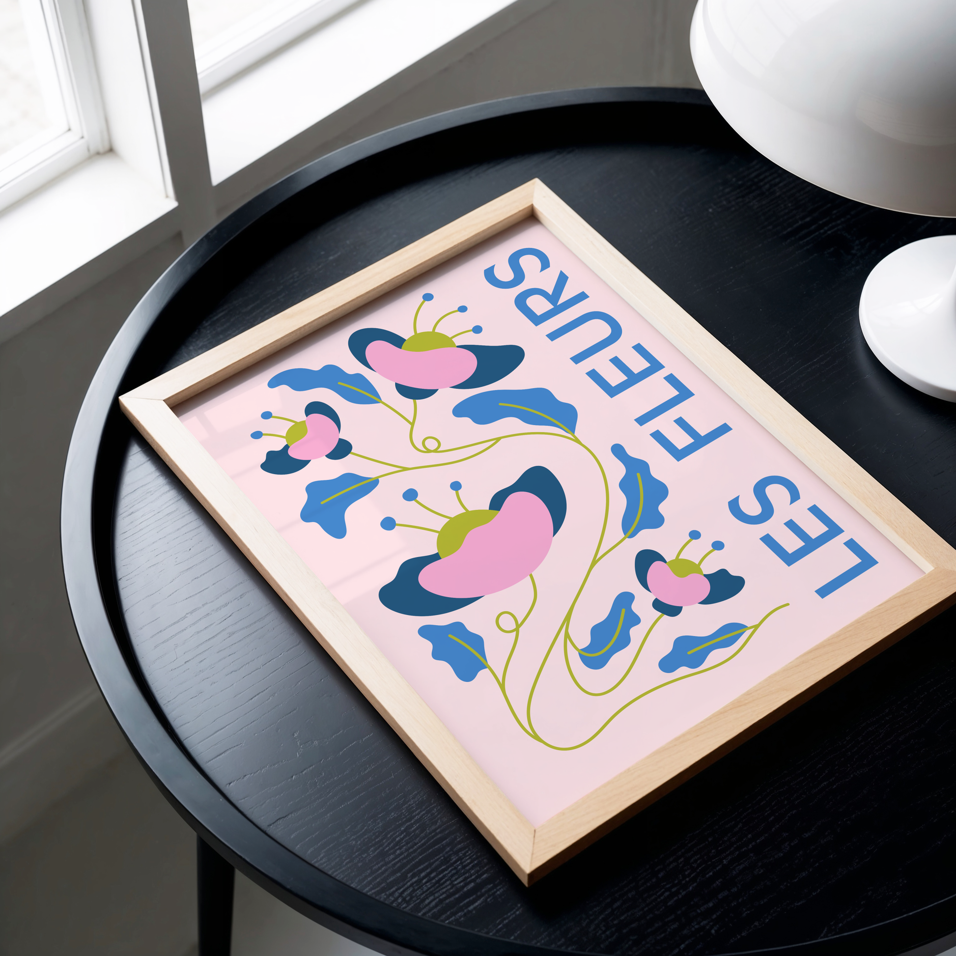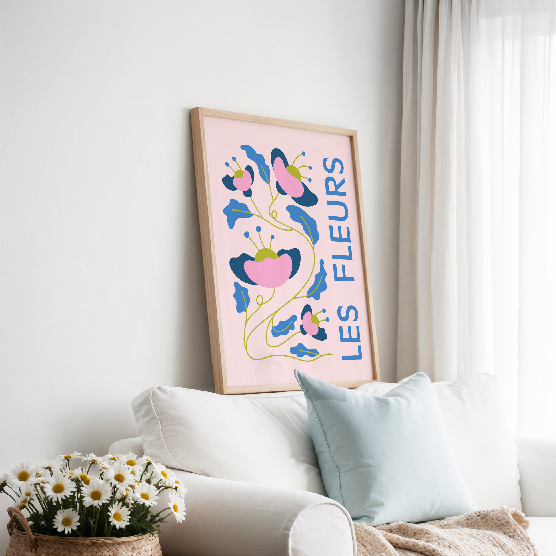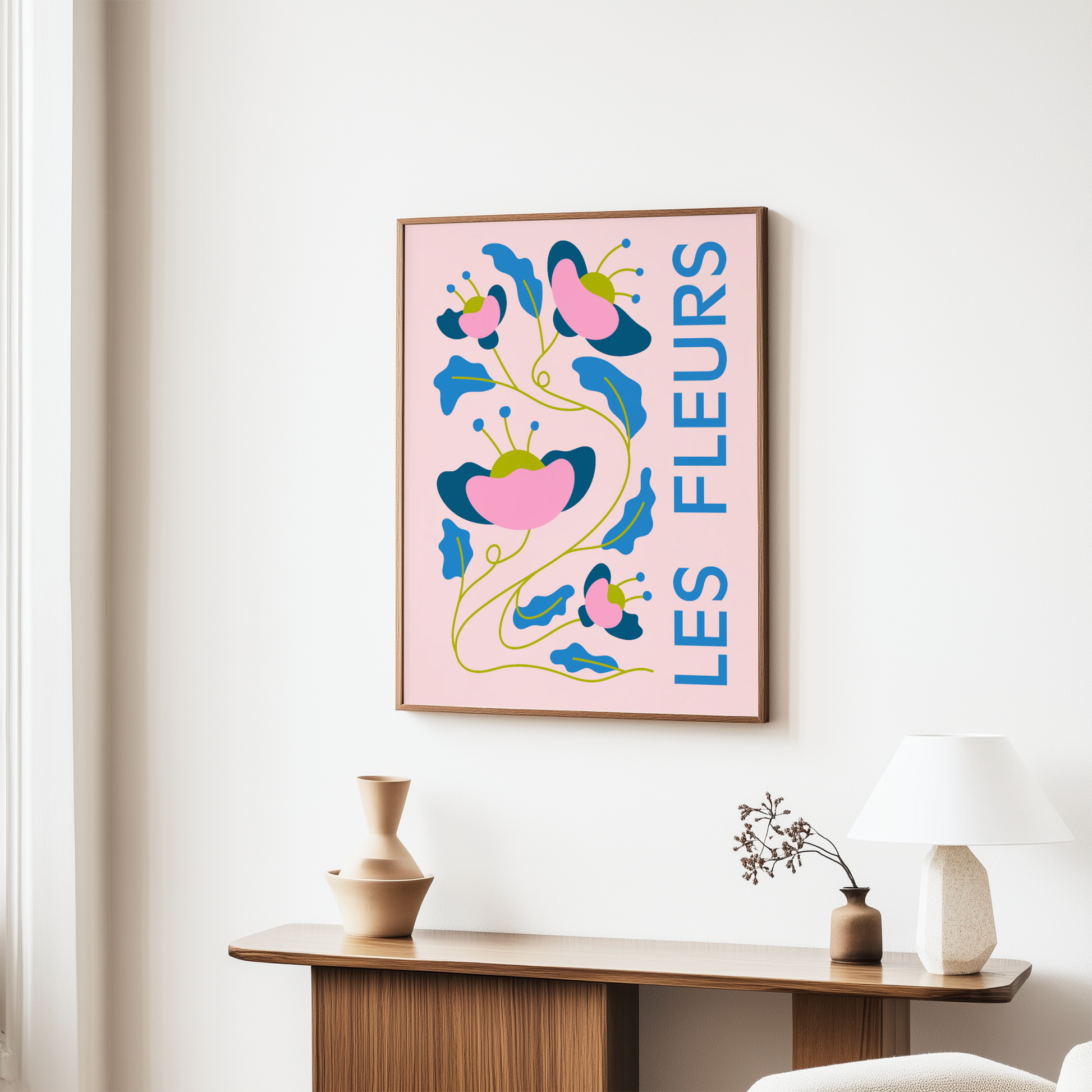 Bring a vibrant burst of floral charm to your space with this eye-catching ‘Les Fleurs’ poster print. This design features a bold floral design in beautiful shades of pink, blue, and green, with the French phrase LES FLEURS displayed vertically in a stylish blue font.