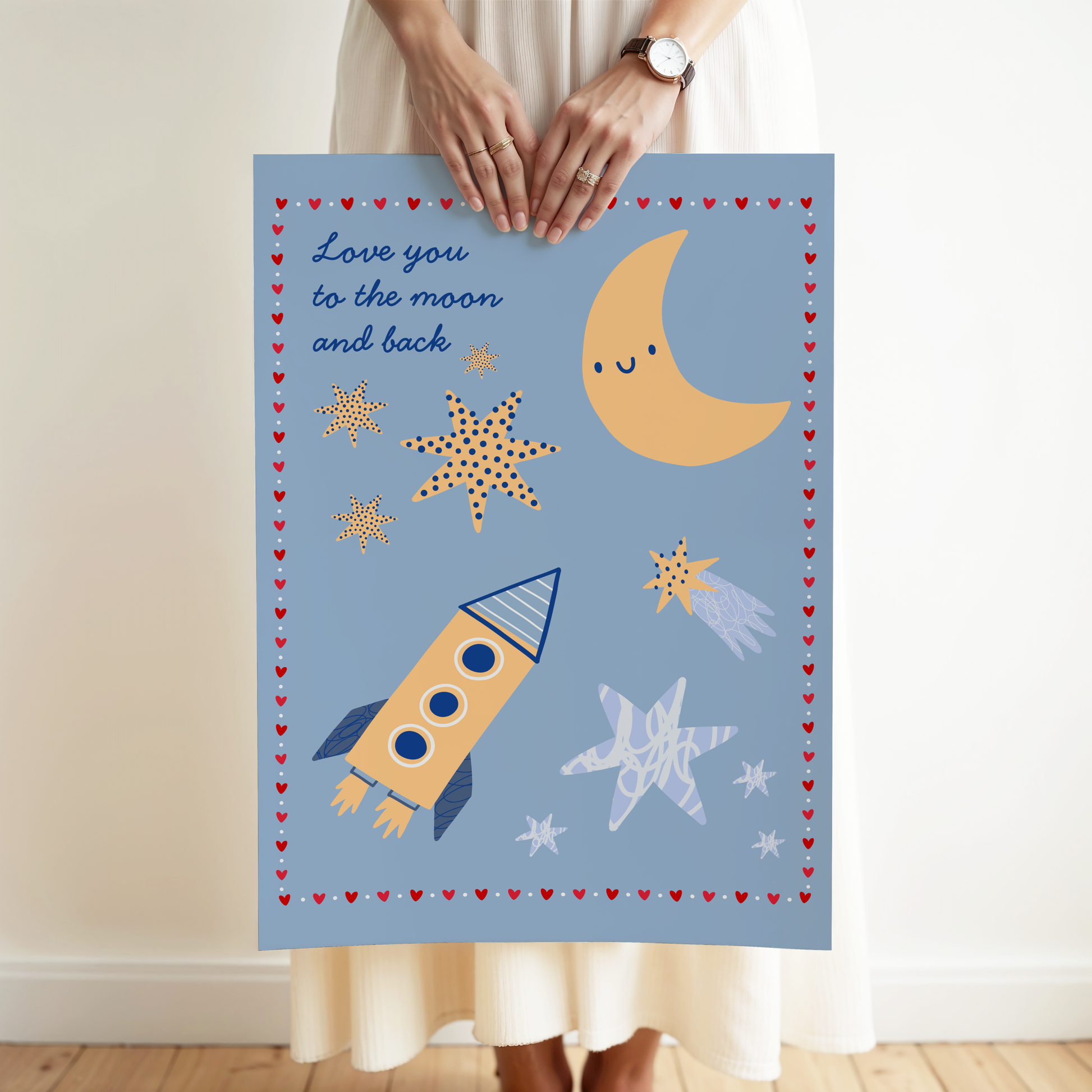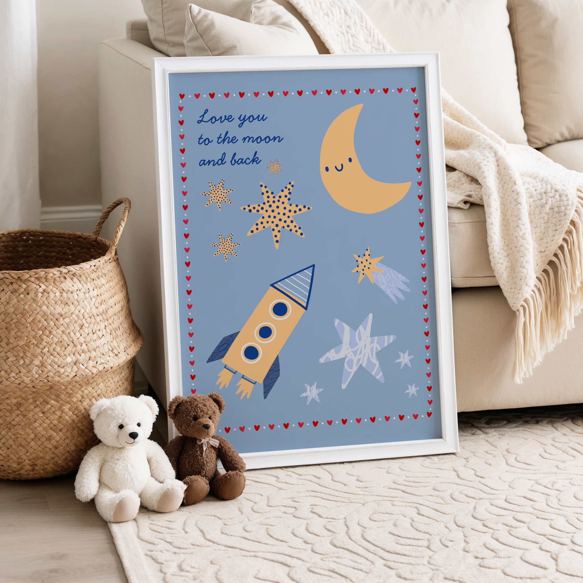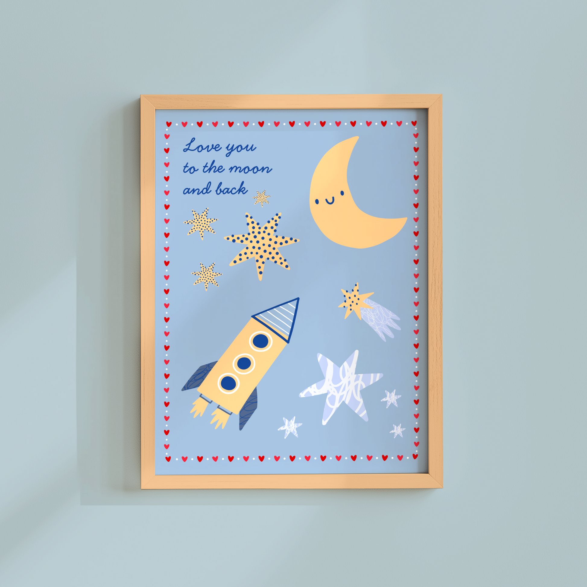 Featuring a smiling crescent moon, patterned stars, and a playful rocket ship, this print brings a dreamy, heartwarming touch to any nursery or child’s bedroom. The soft blue background and whimsical design make it a perfect piece for nurseries, bedrooms or a quiet reading nook.