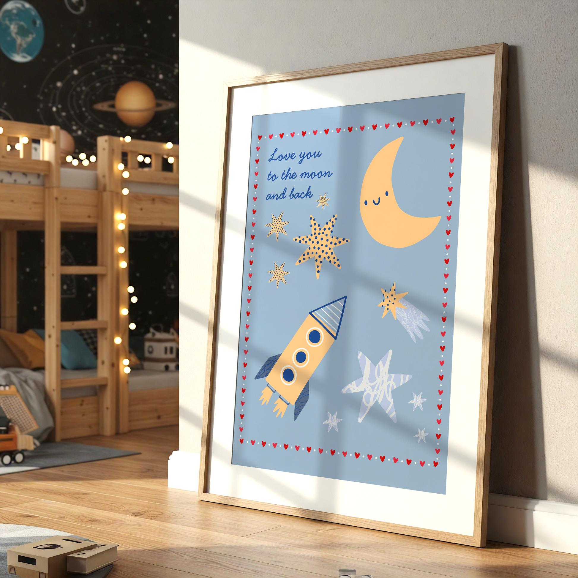 Send your love soaring to the stars with this charming “Love You to the Moon and Back” poster print. 🚀💙