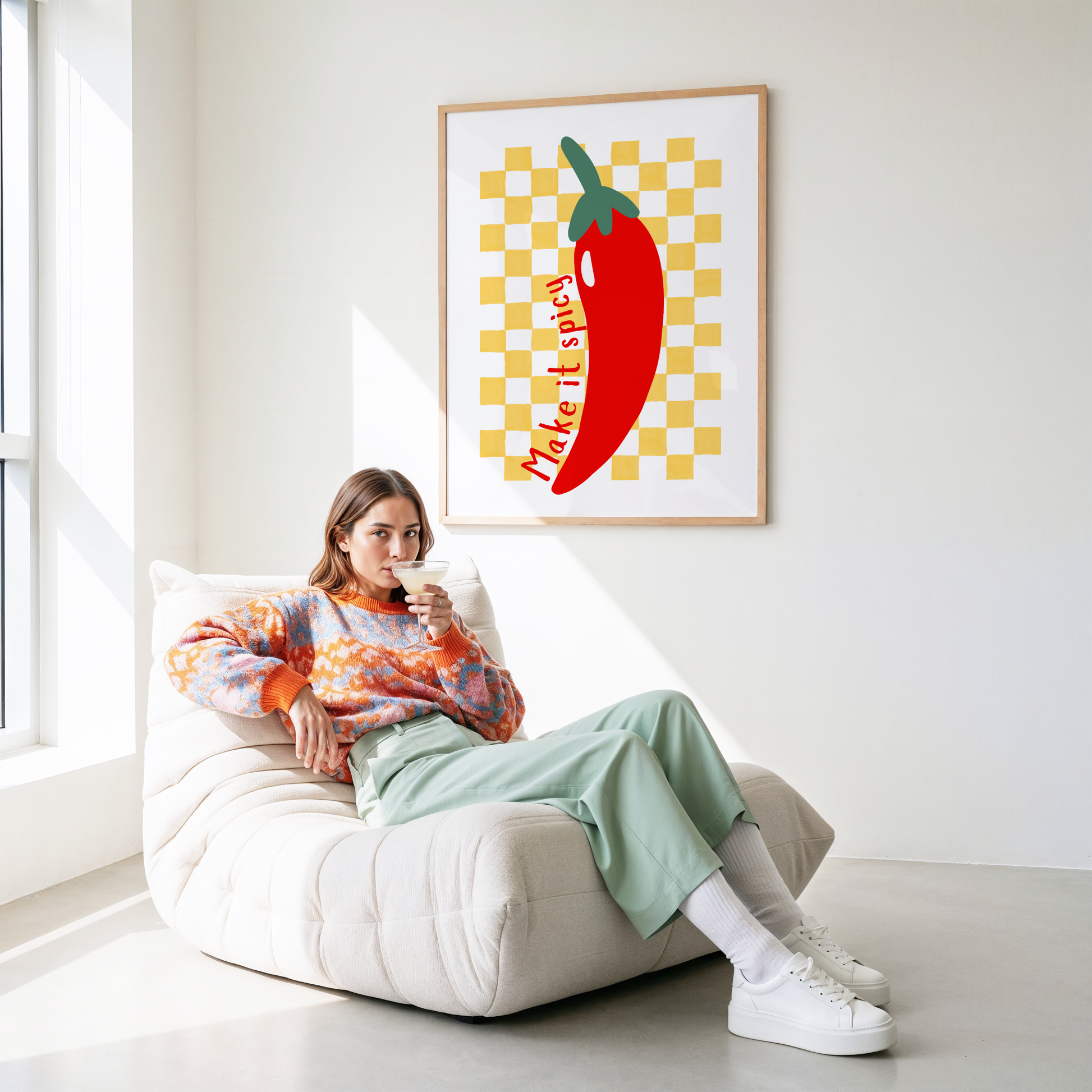 🔥 Spice up your kitchen decor! This bold and playful “Make It Spicy” poster print features a vibrant red chili pepper on a retro yellow checkered background with fun typography. Perfect for foodies, home chefs, or anyone who loves bold, colorful statement art, this print adds instant personality to your kitchen, dining room, or home bar.