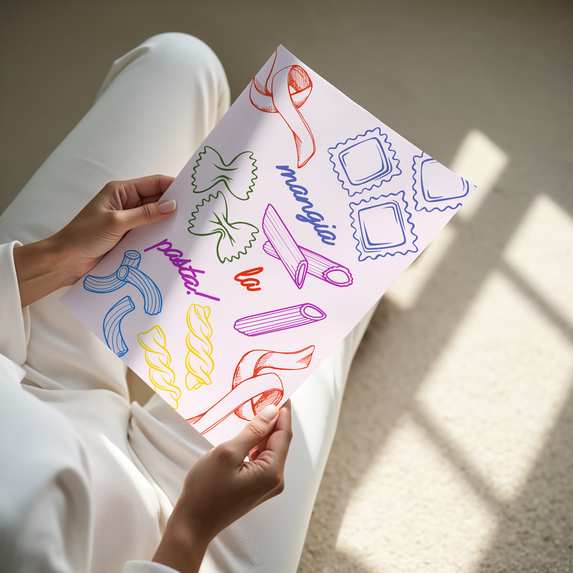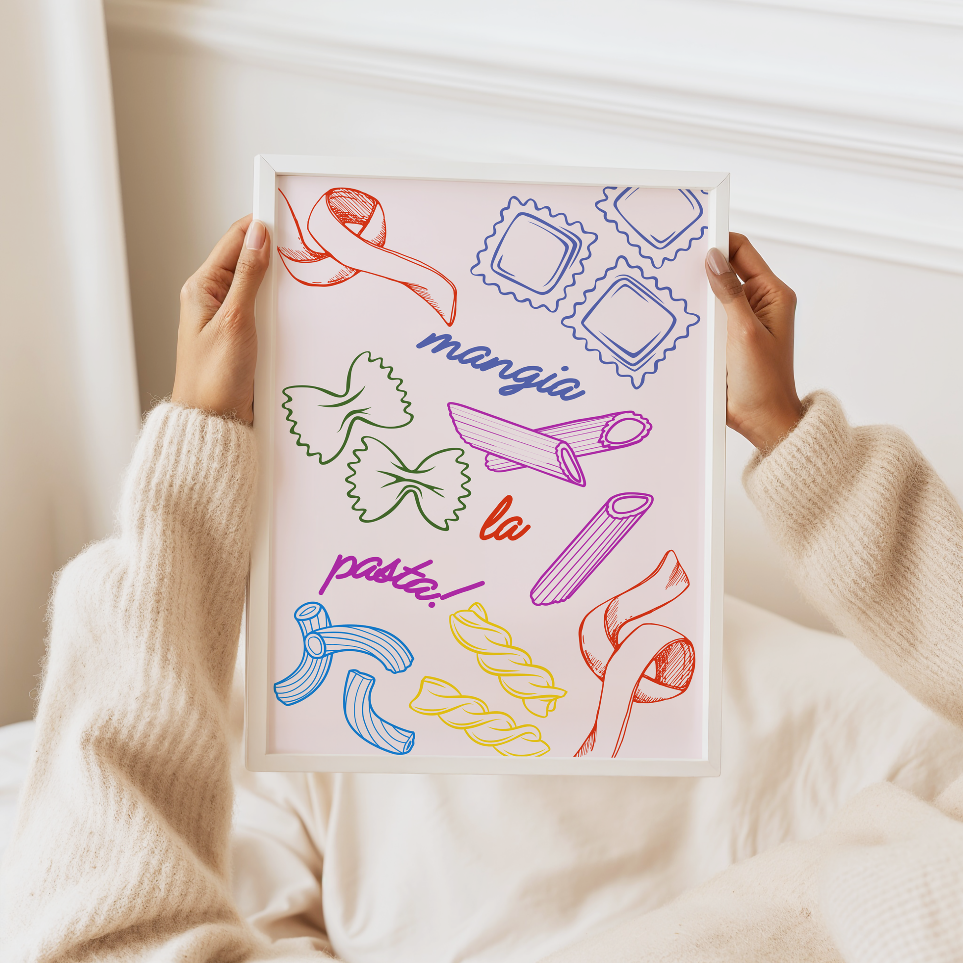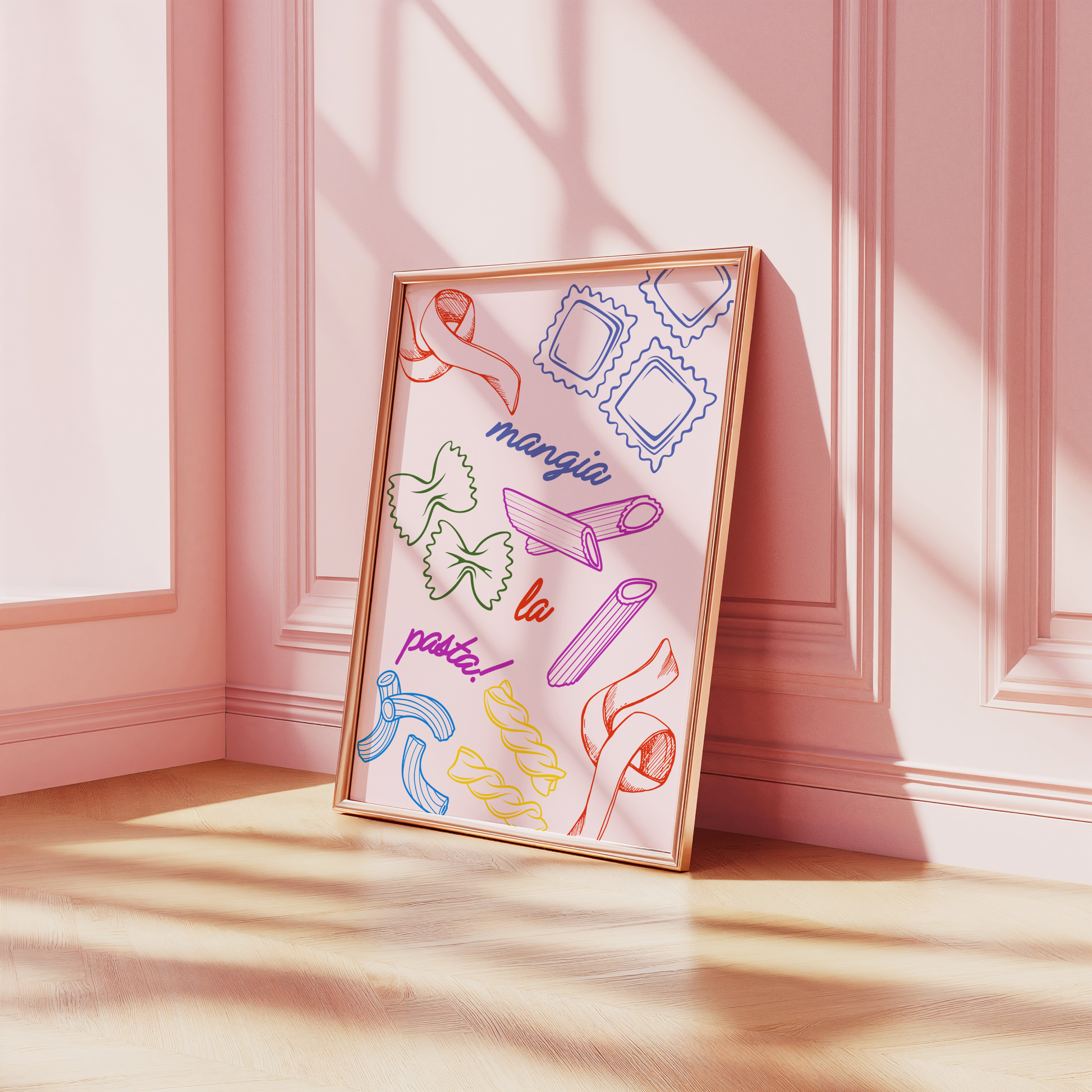 Pasta enthusiasts, this colourful fun poster print is for you. It features different types of pasta (Penne, Ravioli, Tagliatelle, Farfalle, Fusilli) and the phrase "Mangia La Pasta." This charming and striking piece will be a loveable addition to your kitchen or dining space.