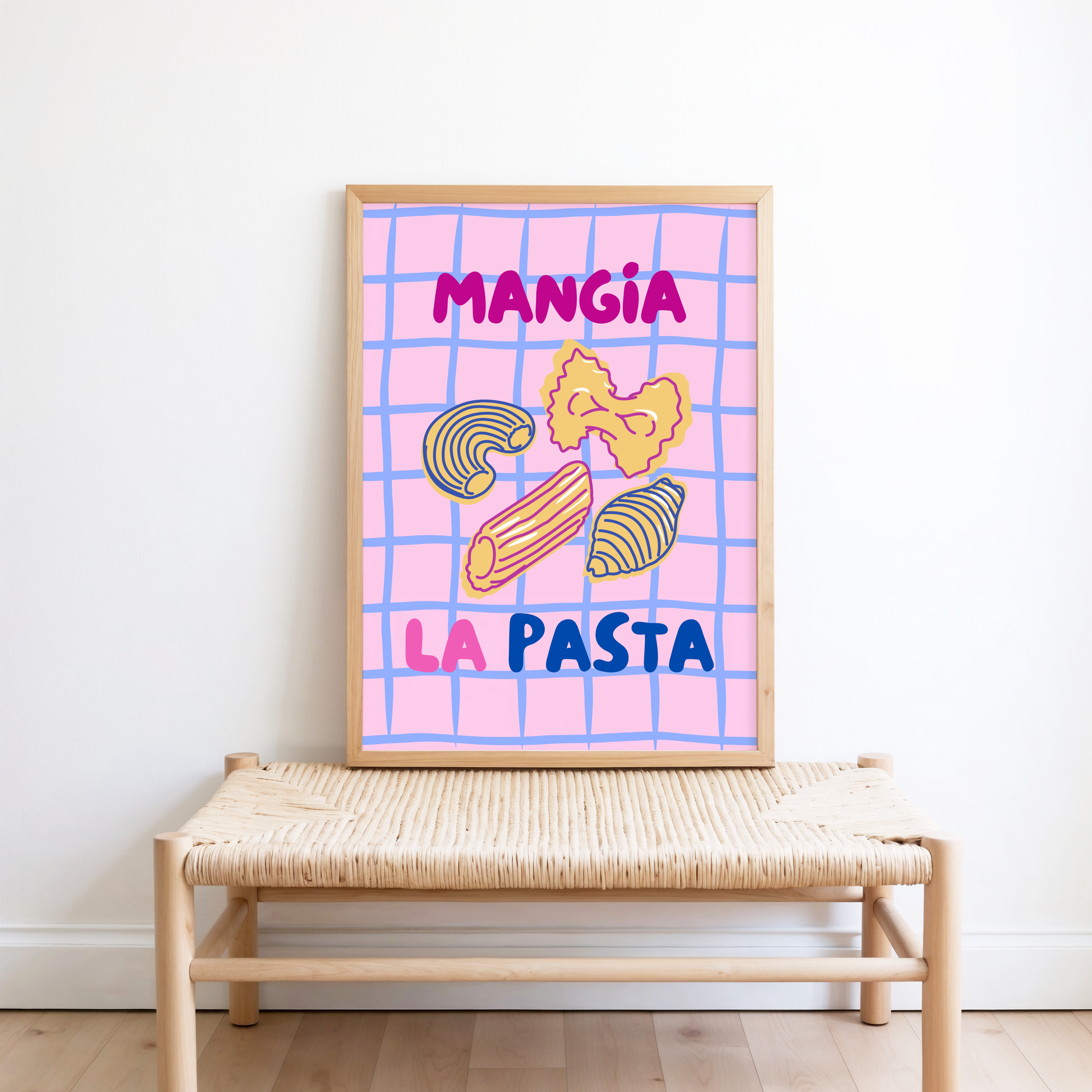 This design features a playful display of various pasta shapes arranged on a pink and blue checkered tablecloth. The phrase Mangia La Pasta ("Eat the pasta") is written in stylish, eye-catching typography, bringing both personality and vibrancy to your space.