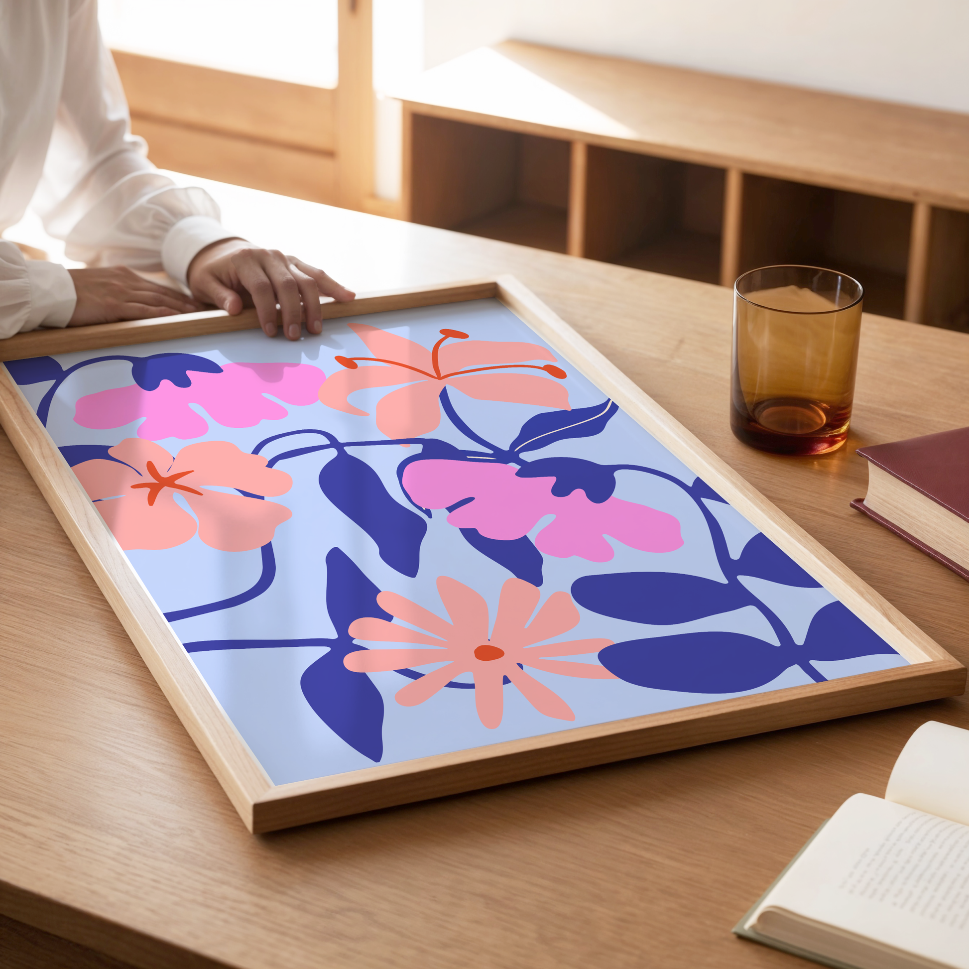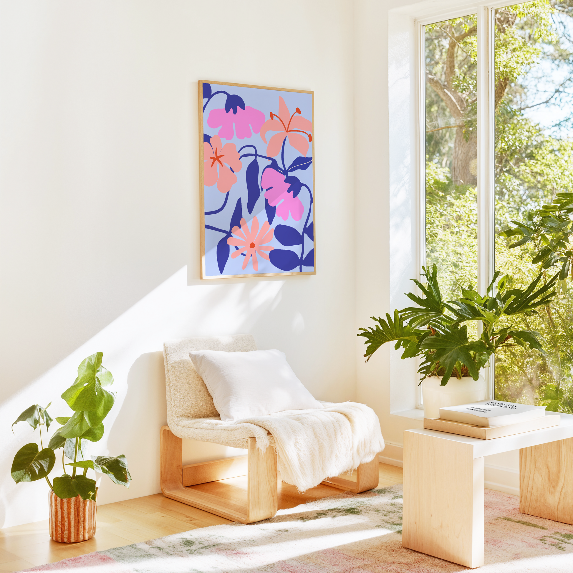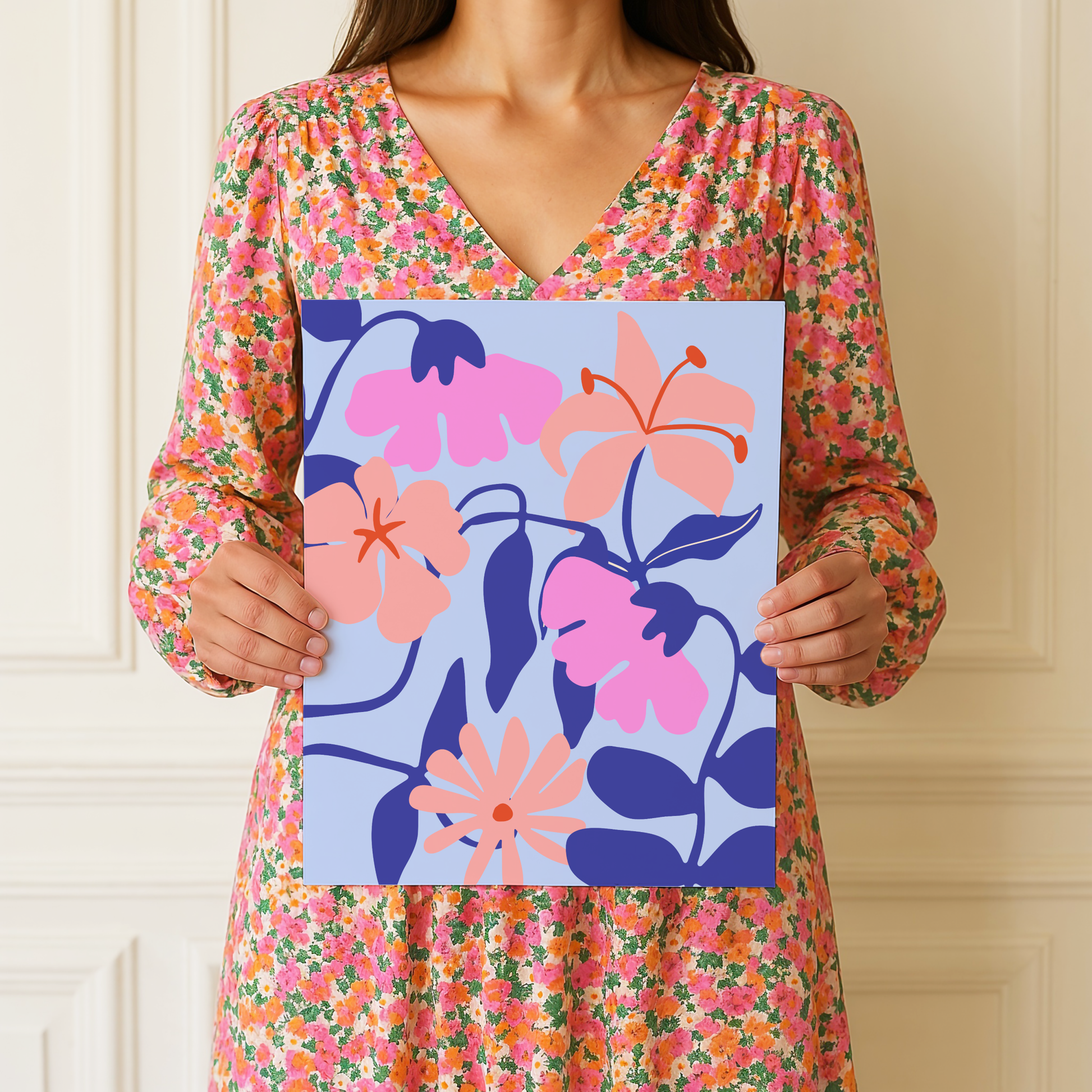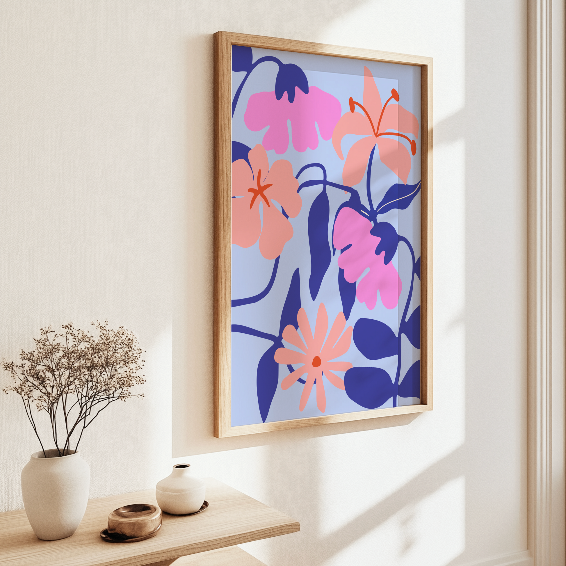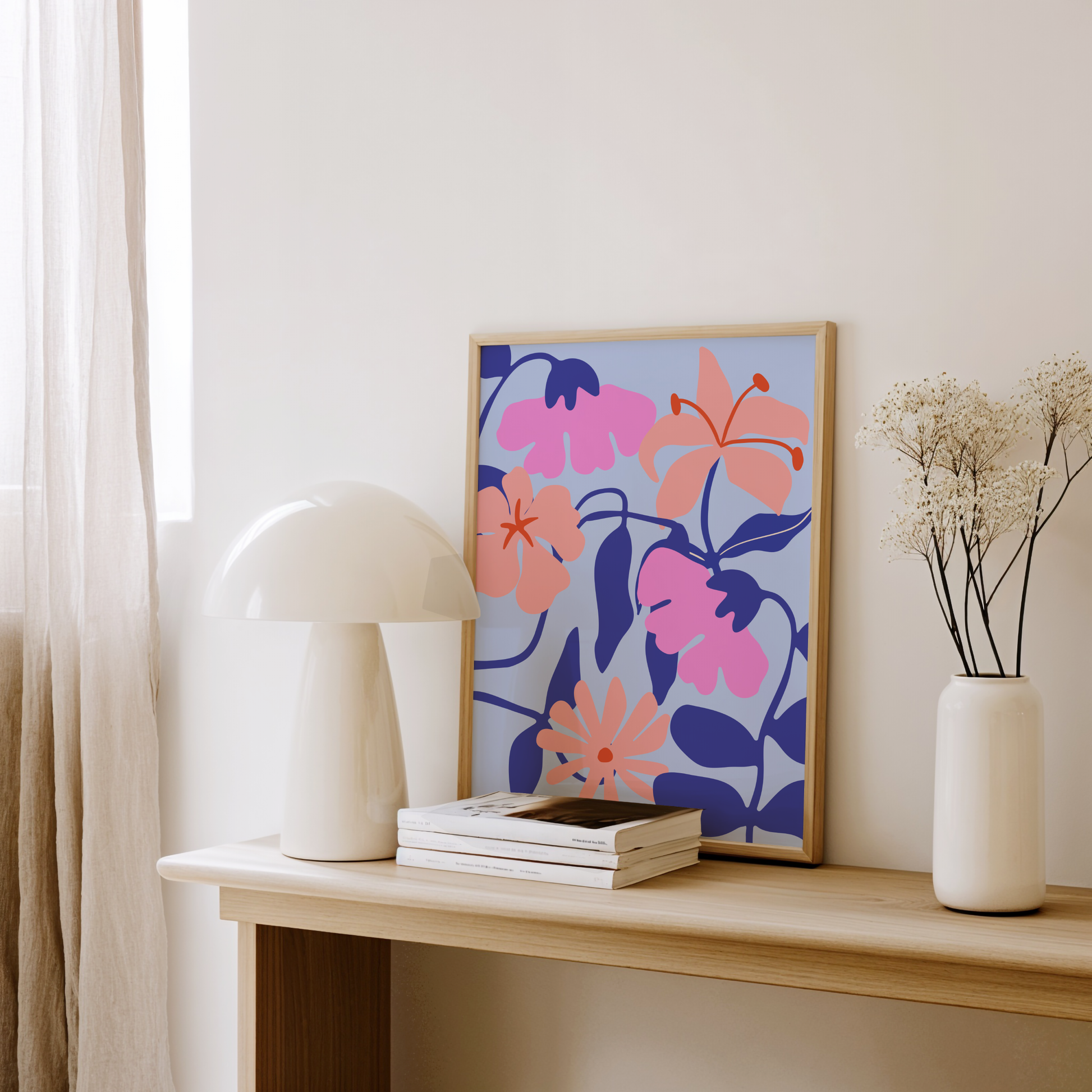Brighten up your space with this fun and vibrant botanical poster print. The design features an arrangement of pink and orange abstract flowers, set on a light blue background. Perfect for adding a contemporary touch to any room. Ideal for brightening up your living room, bedroom, nursery, or office, this piece combines playful tones with modern style.