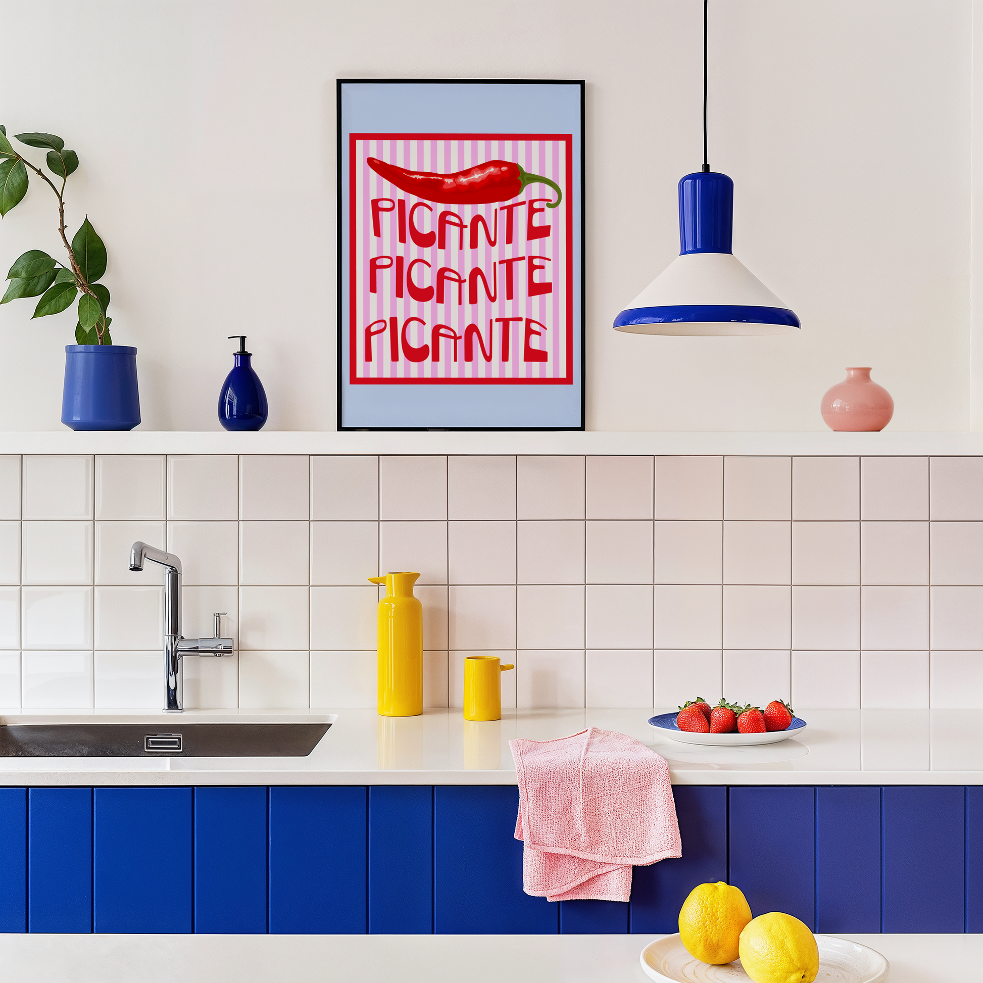 Turn up the heat in your kitchen or dining space with the bold and colourful Picante poster print. Featuring the word “Picante” repeated three times in a groovy red font alongside a fiery red chili, this vibrant artwork pops against a fun striped background of pink, white, and blue.