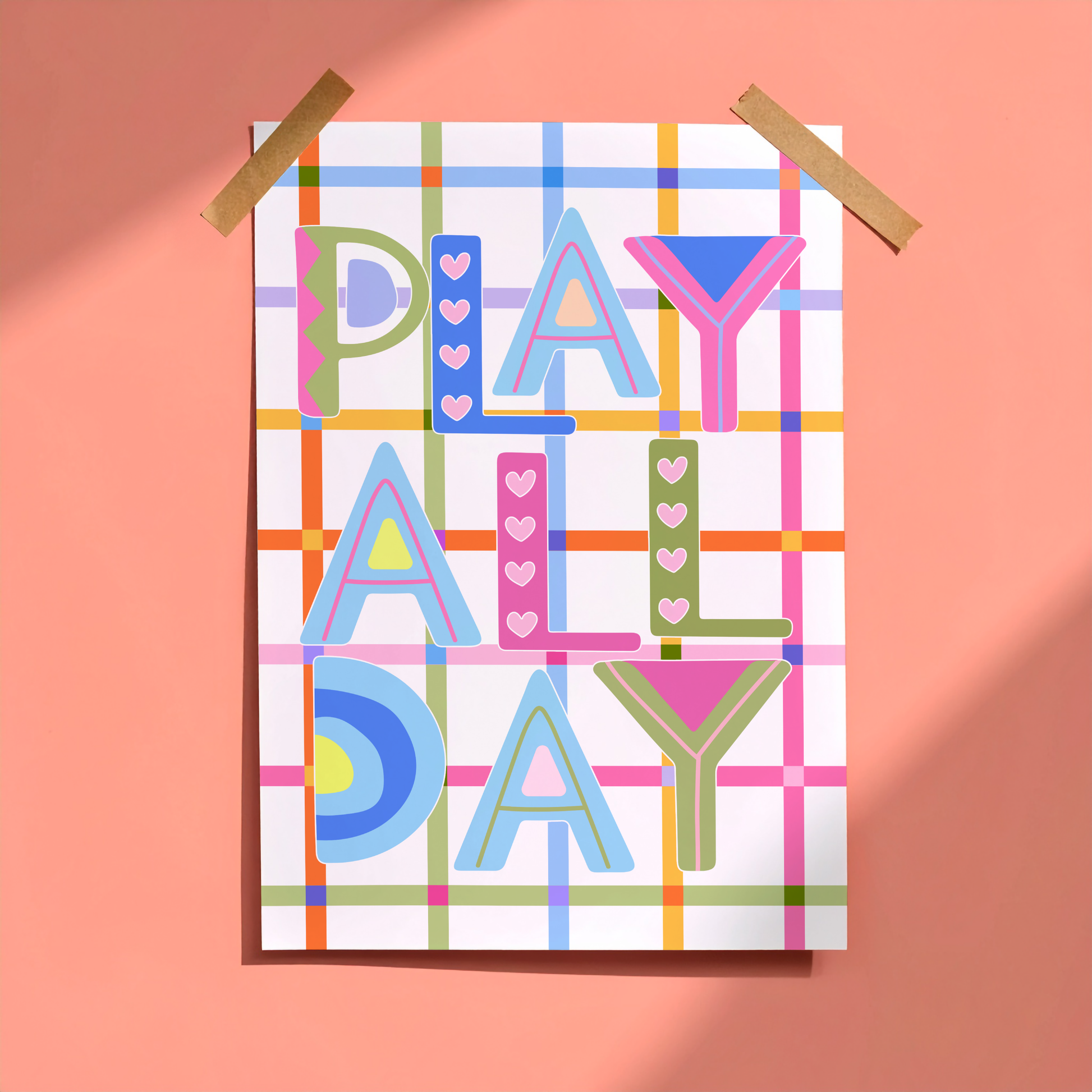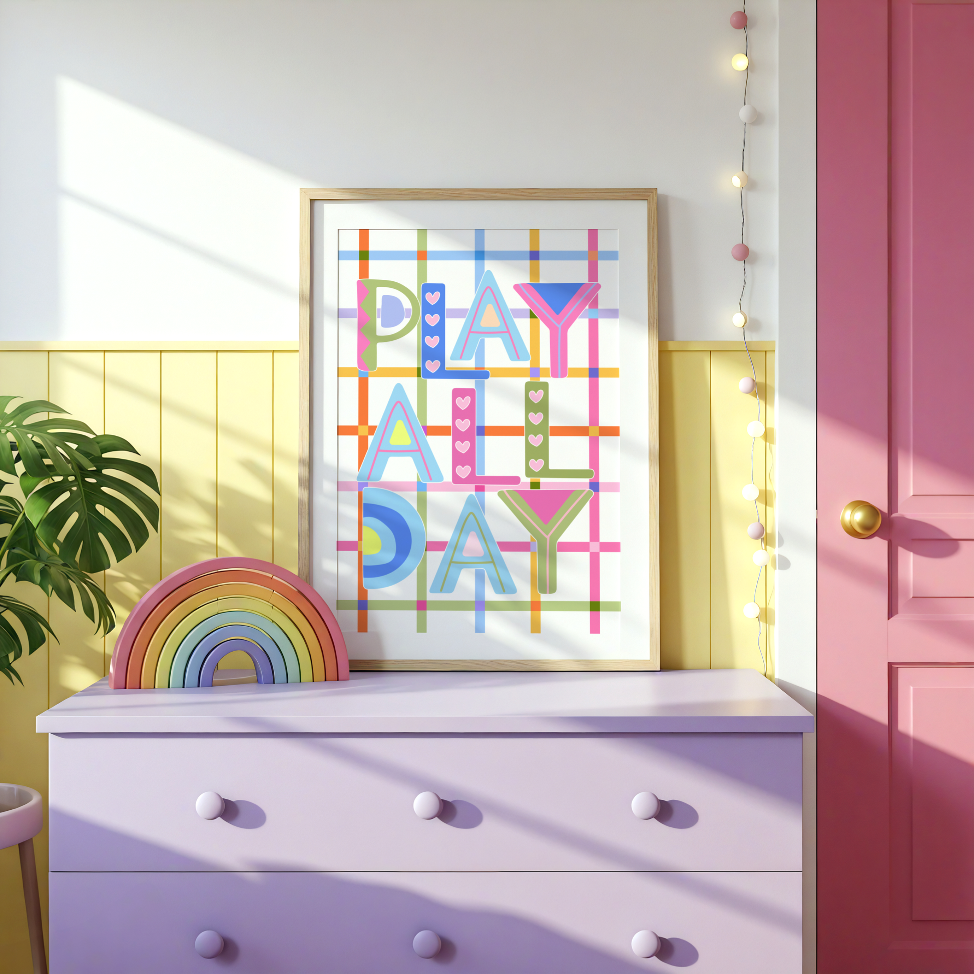 Add joy, colour, and playfulness to your little one’s space with this “Play All Day” poster print. Featuring bold, colourful lettering and a playful plaid background, this vibrant design makes the perfect statement piece for a kids’ bedroom, nursery, or playroom.