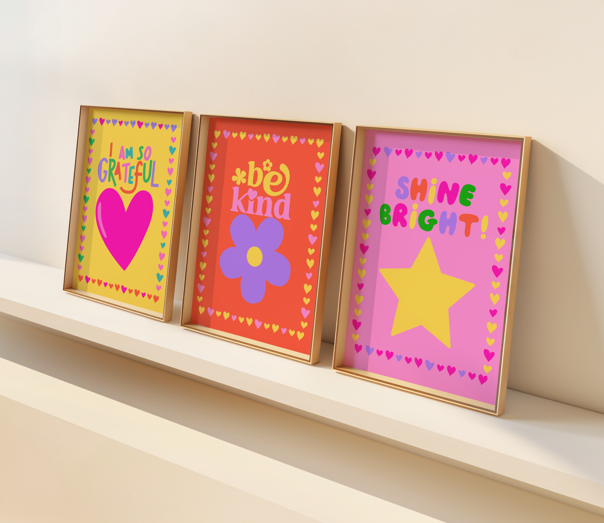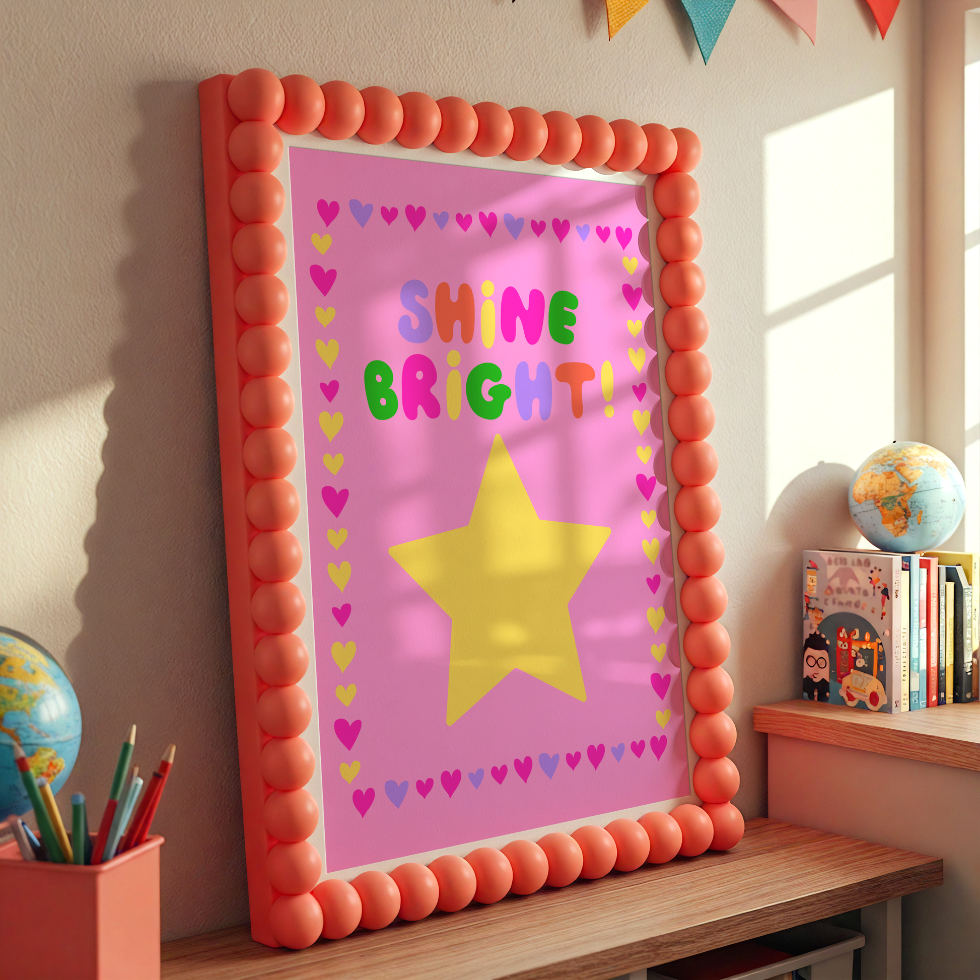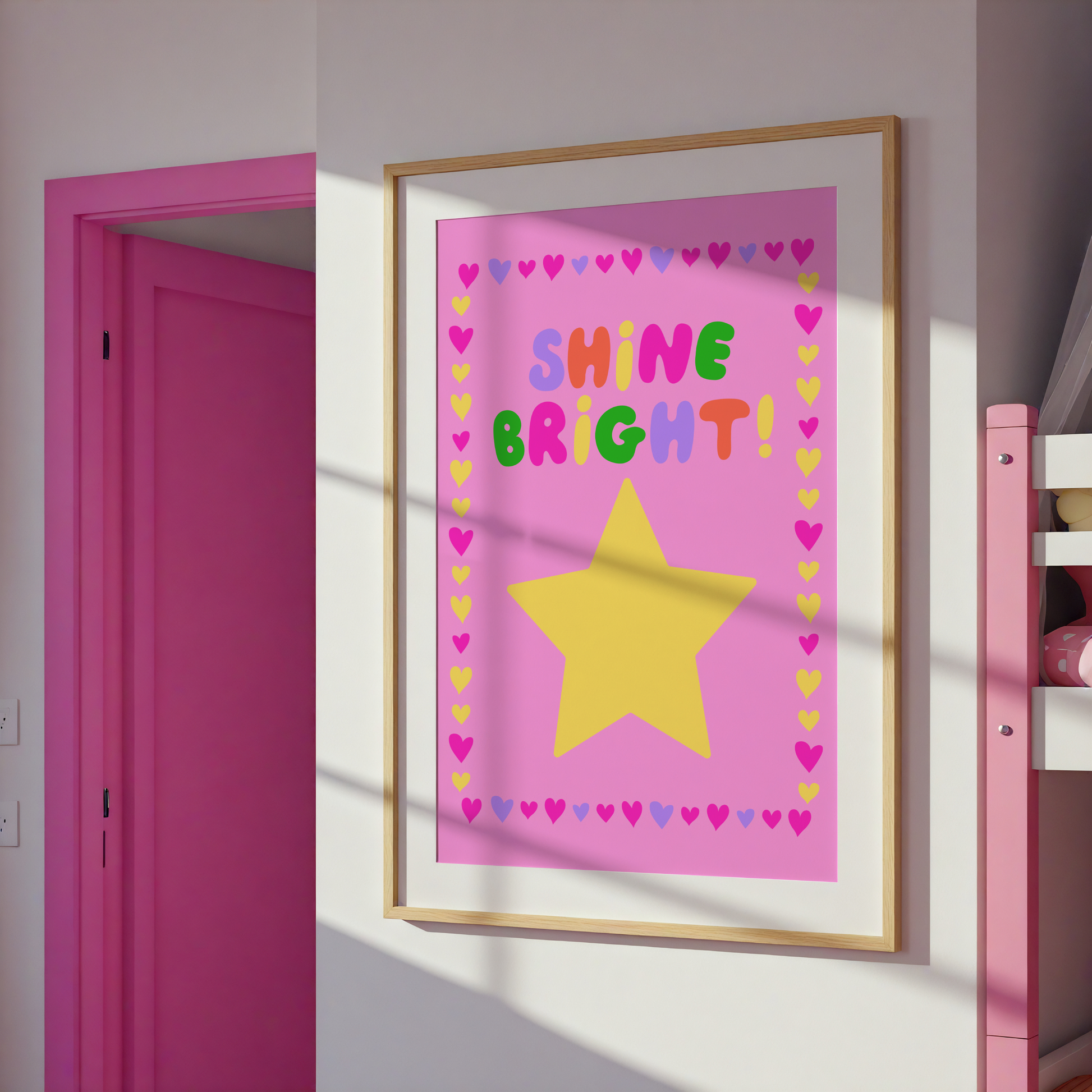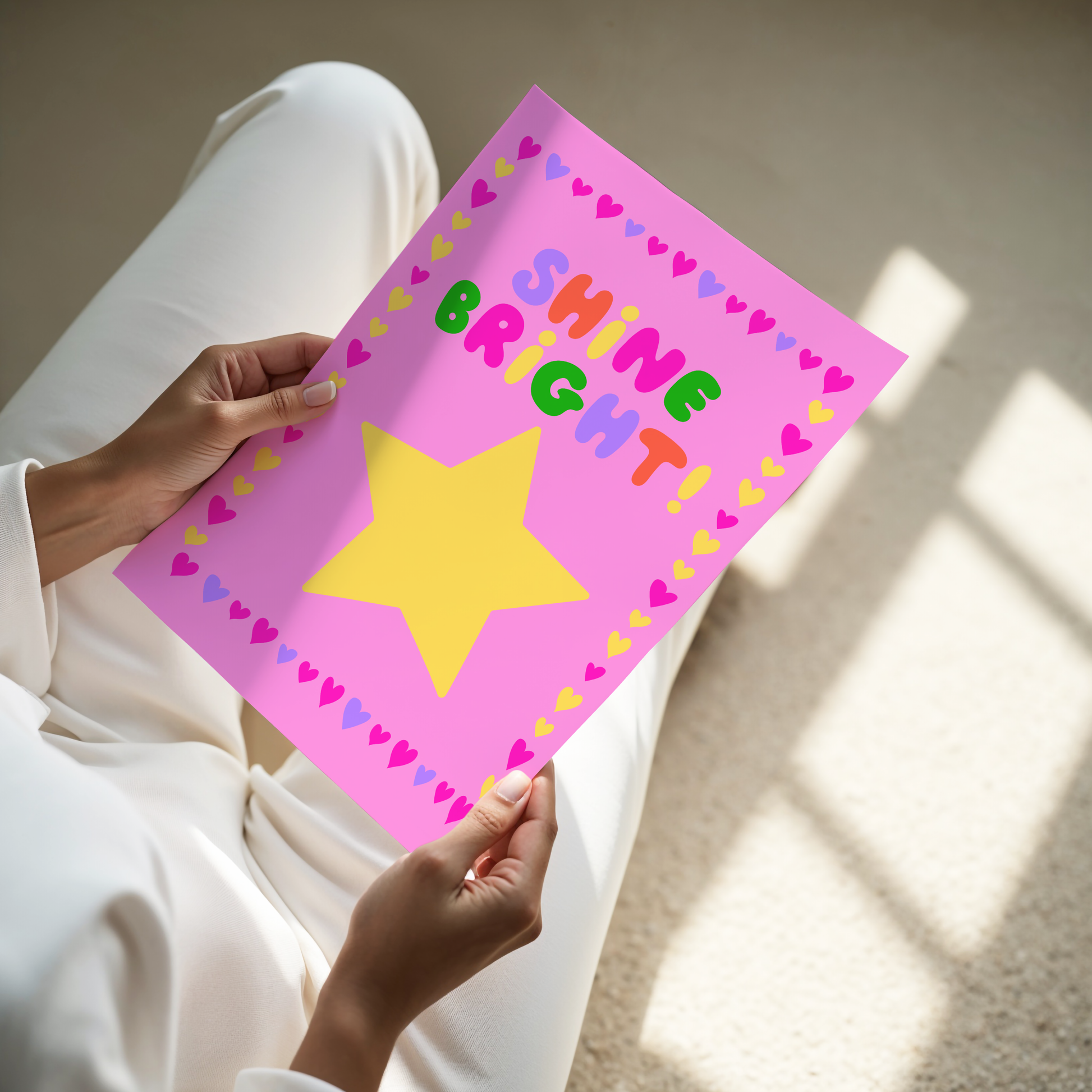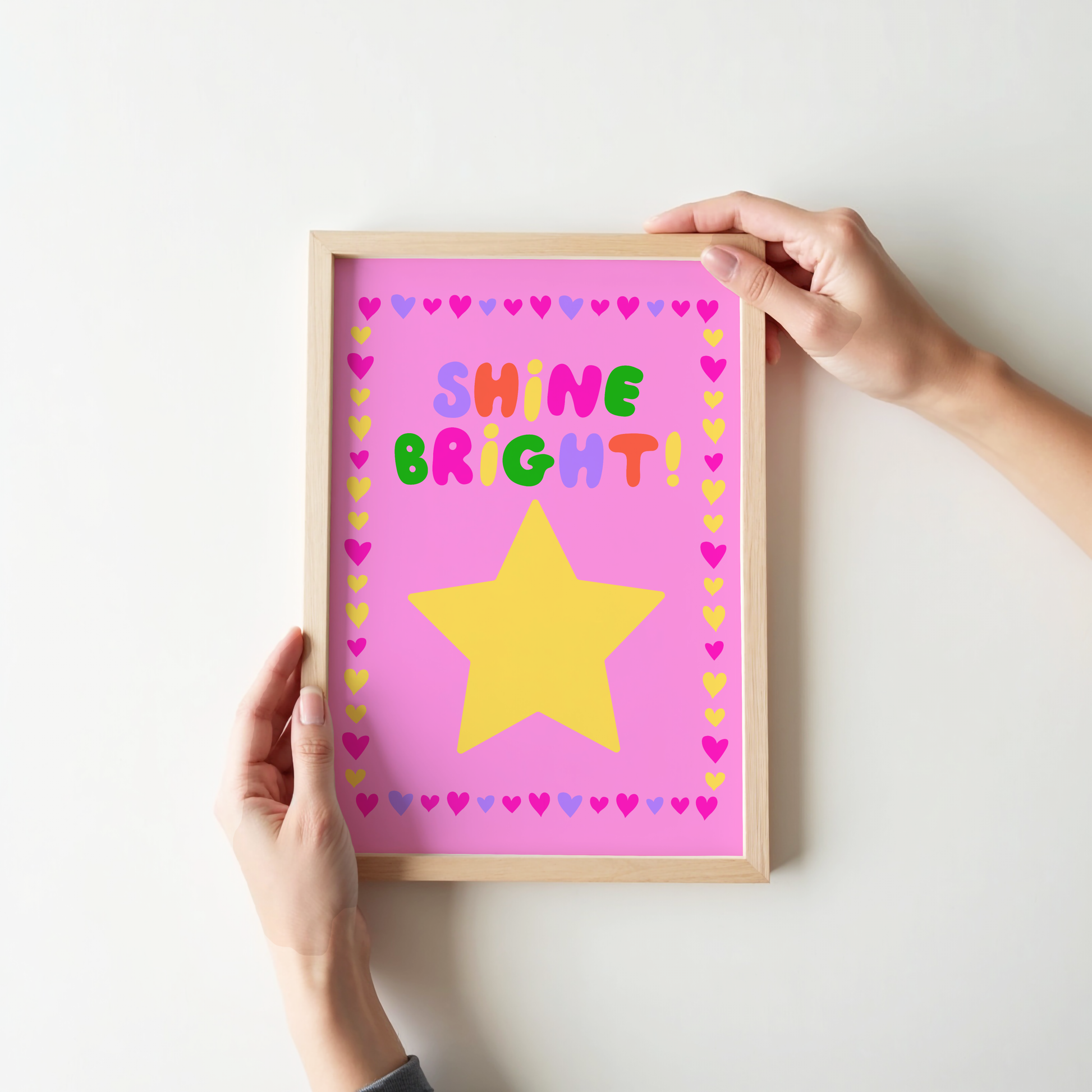 Spread positivity and encouragement with this sweet and vibrant “Shine Bright” poster print. Featuring a yellow star, a playful love heart frame, and uplifting typography, this colourful print brings joy, confidence, and a touch of sparkle to any space.