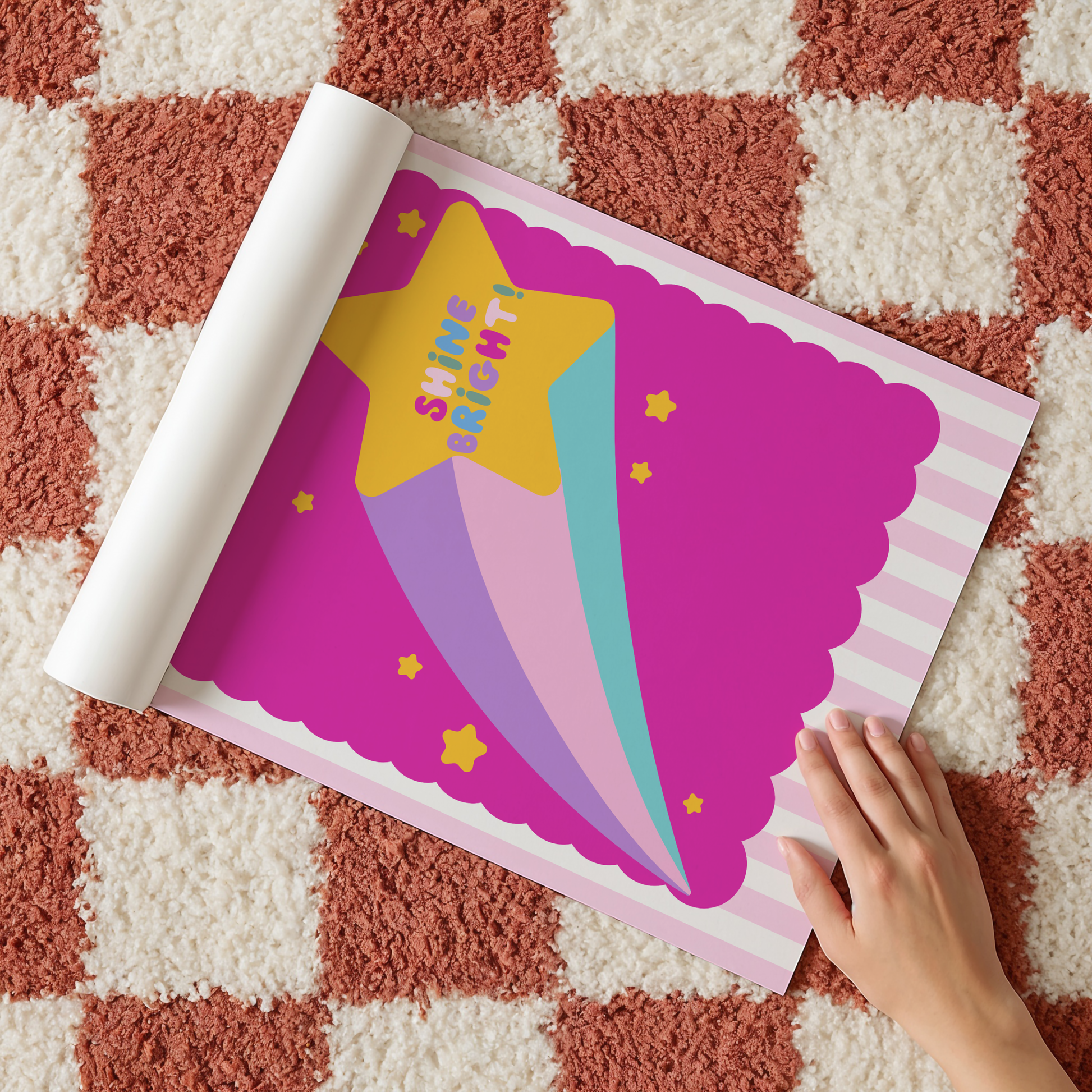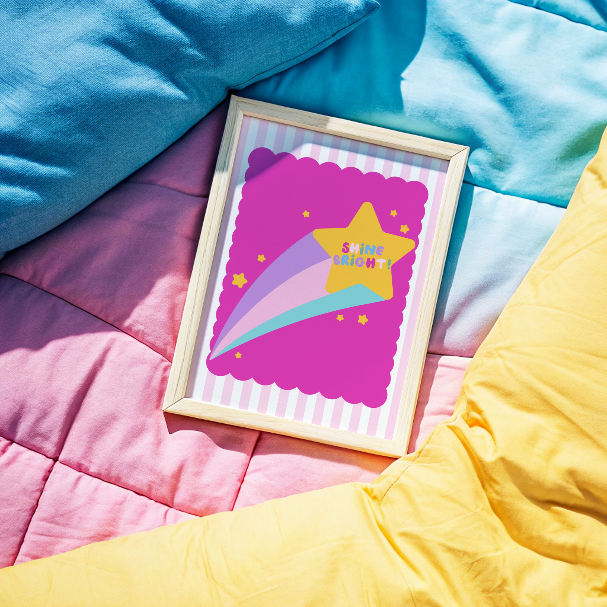 Bring colour, positivity, and a little sparkle to your child’s space with this “Shine Bright” poster print. Featuring a bold yellow star, pastel rainbow trail, and the uplifting phrase “Shine Bright”, this vibrant design is perfect for inspiring joy and confidence in little ones.