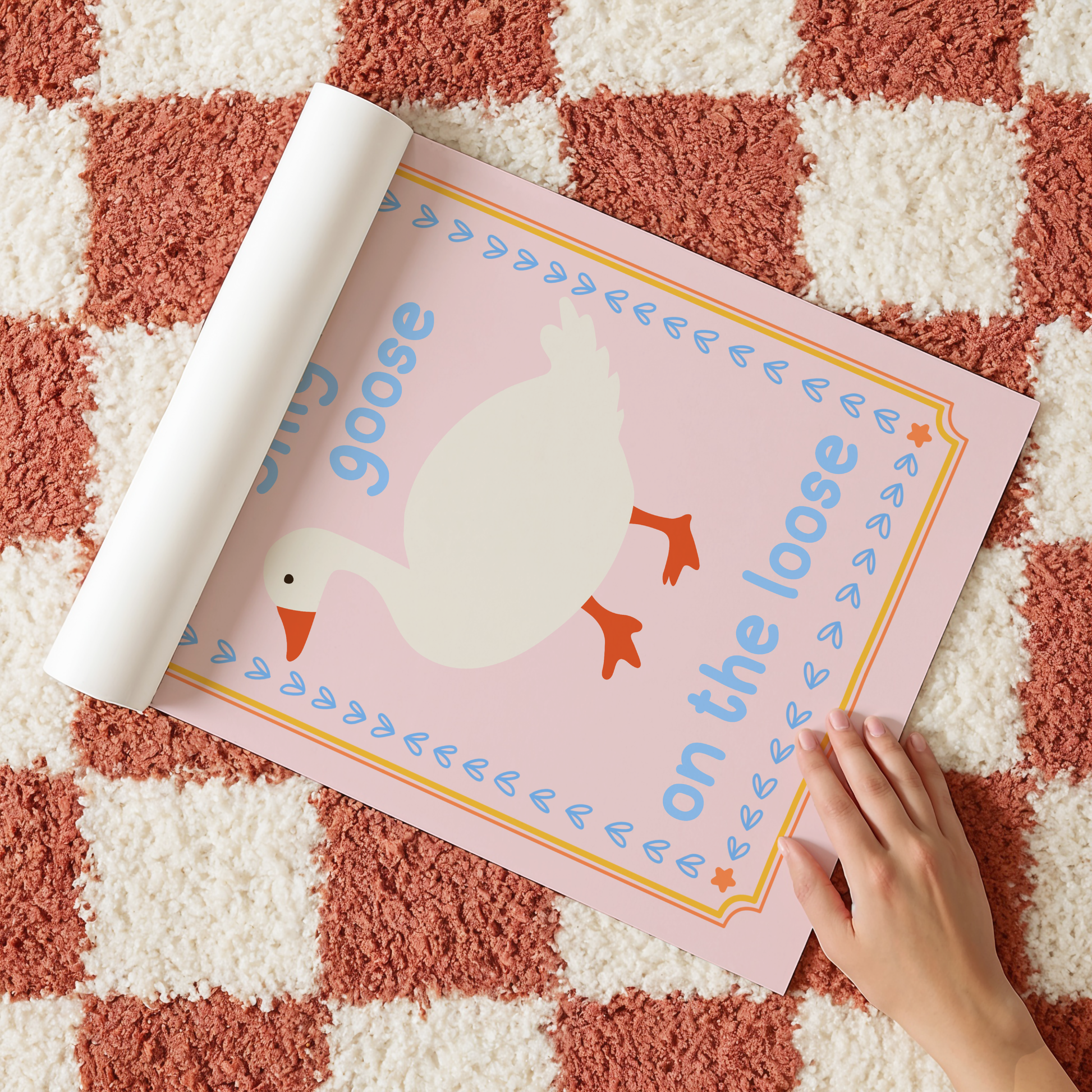 This delightful “Silly Goose on the Loose” poster print is perfect for adding playfulness to any space. Featuring a whimsical goose illustration with sweet pastel colours and a retro-inspired border, this artwork makes a fun statement in your nursery, kids’ bedroom, playroom, or farmhouse kitchen.