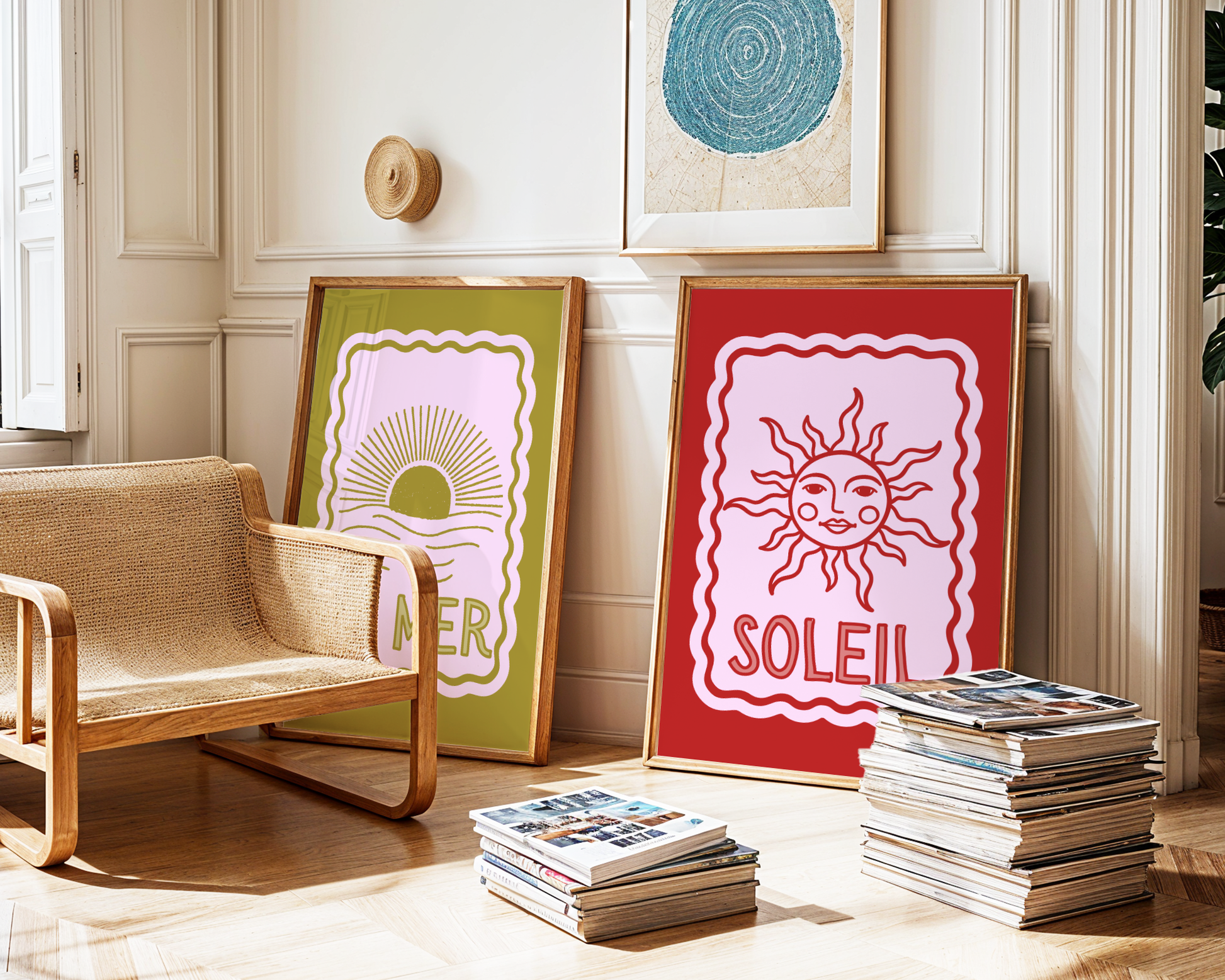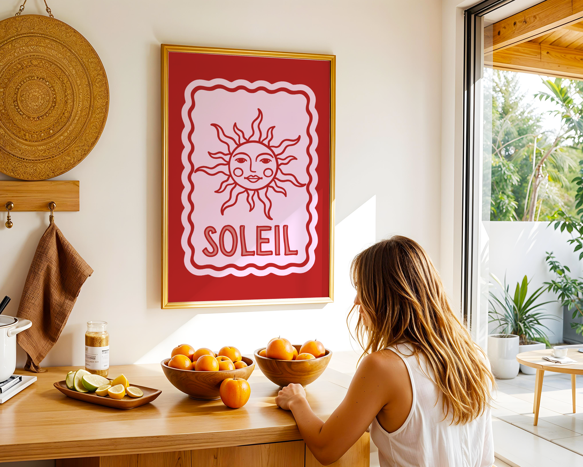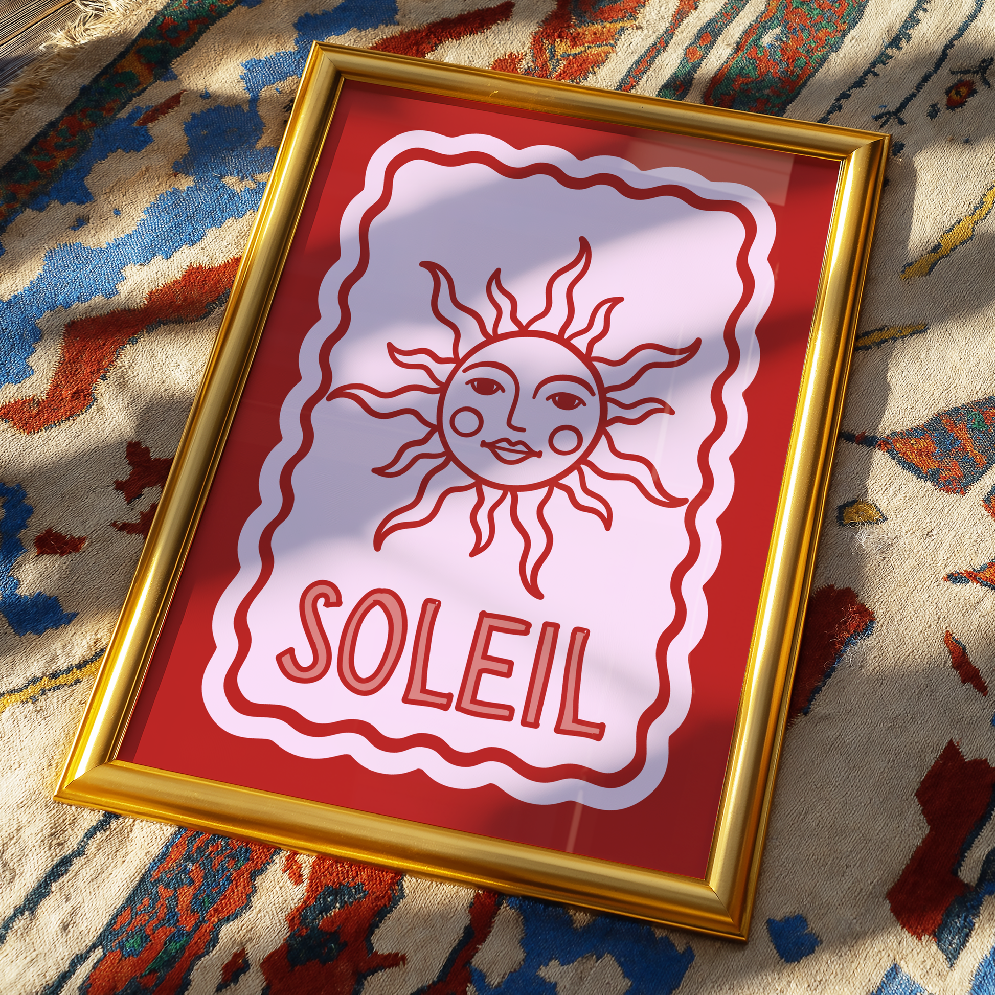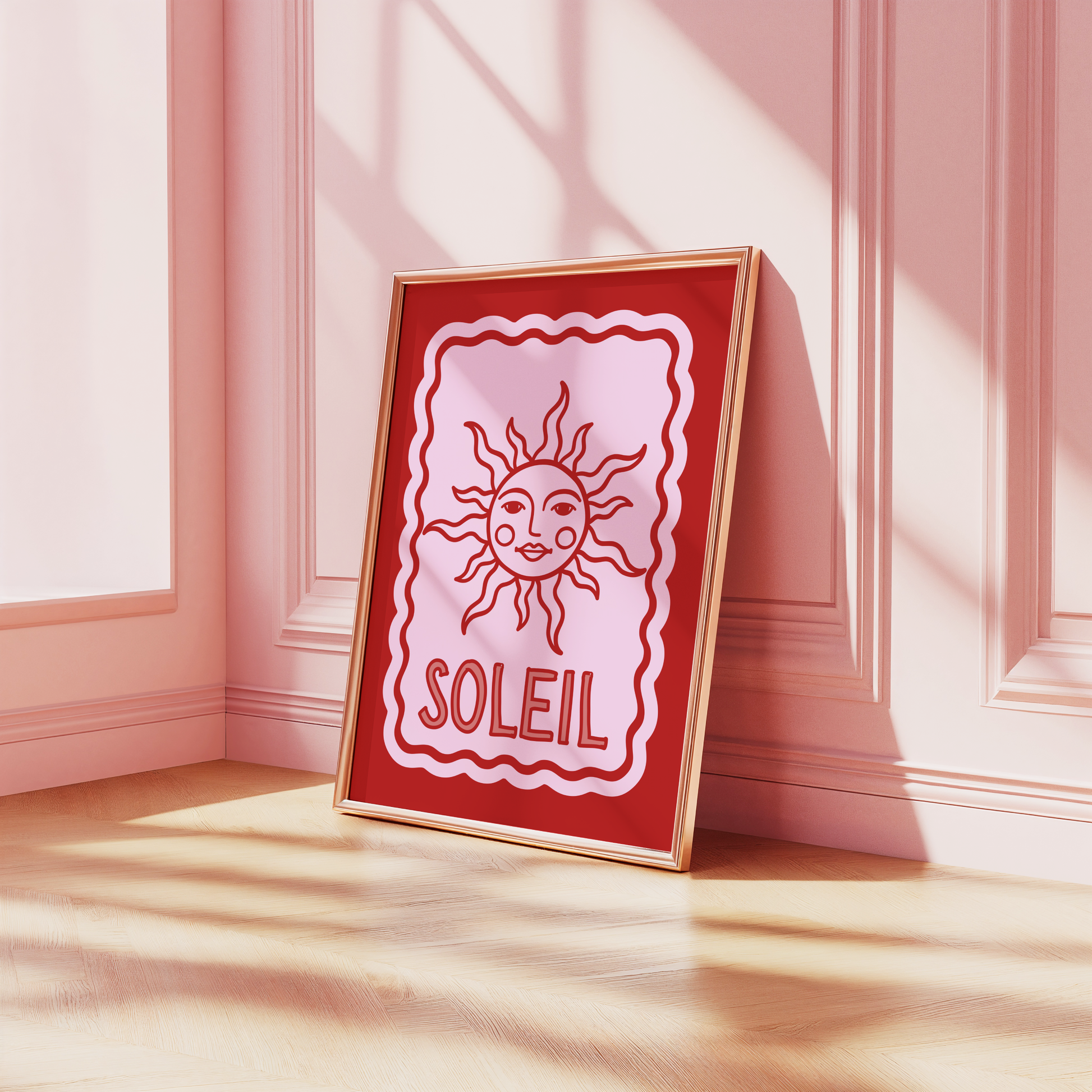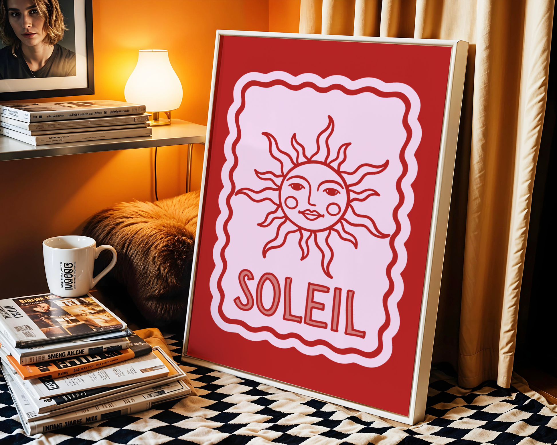 Introducing "SOLEIL" red and pink poster print. This charming design features a stylish line drawing of the sun, accompanied by the word 'Soleil' in red typography. It's the perfect way to infuse your space with summer vibes.