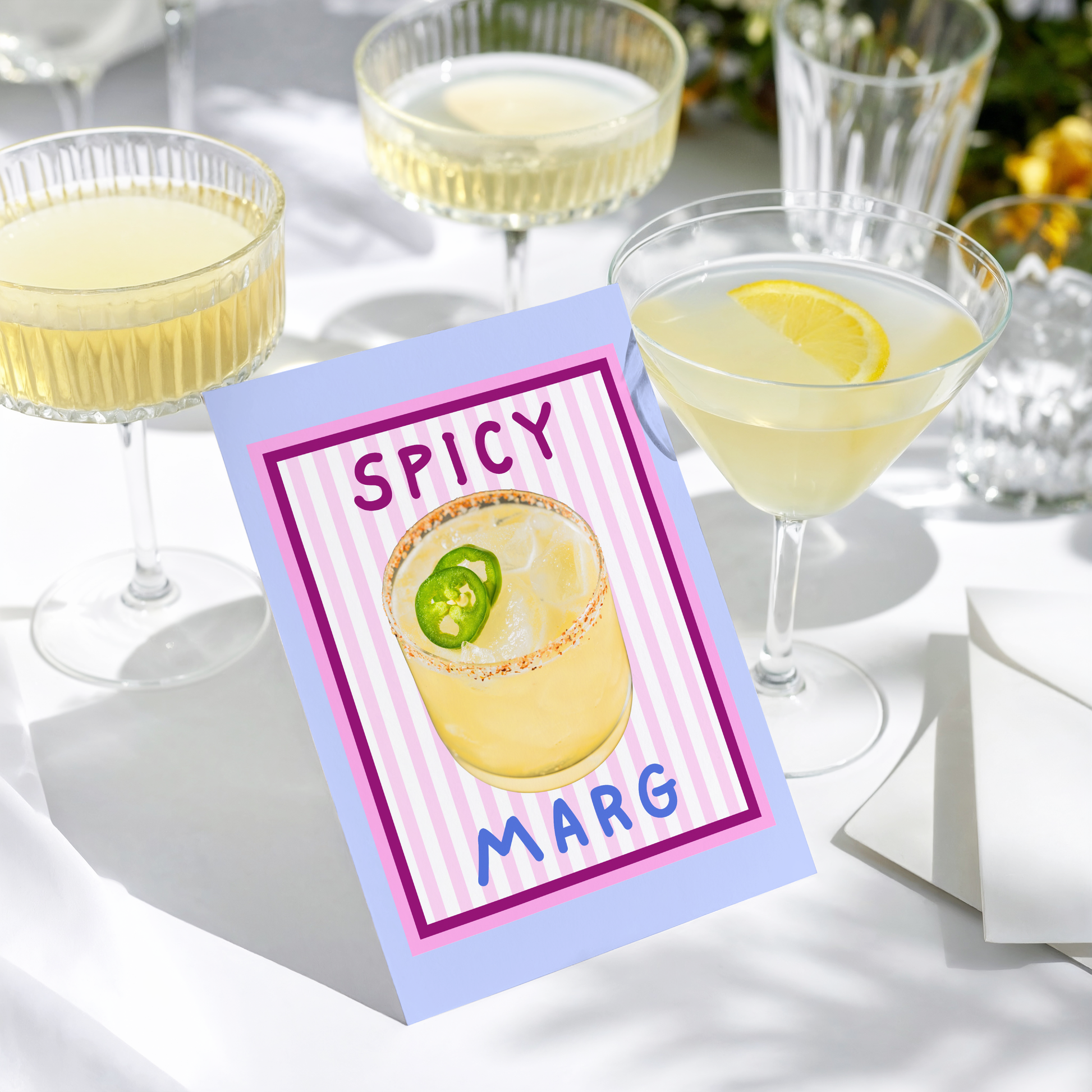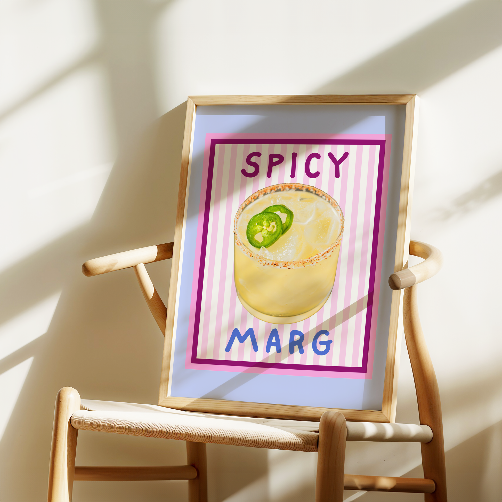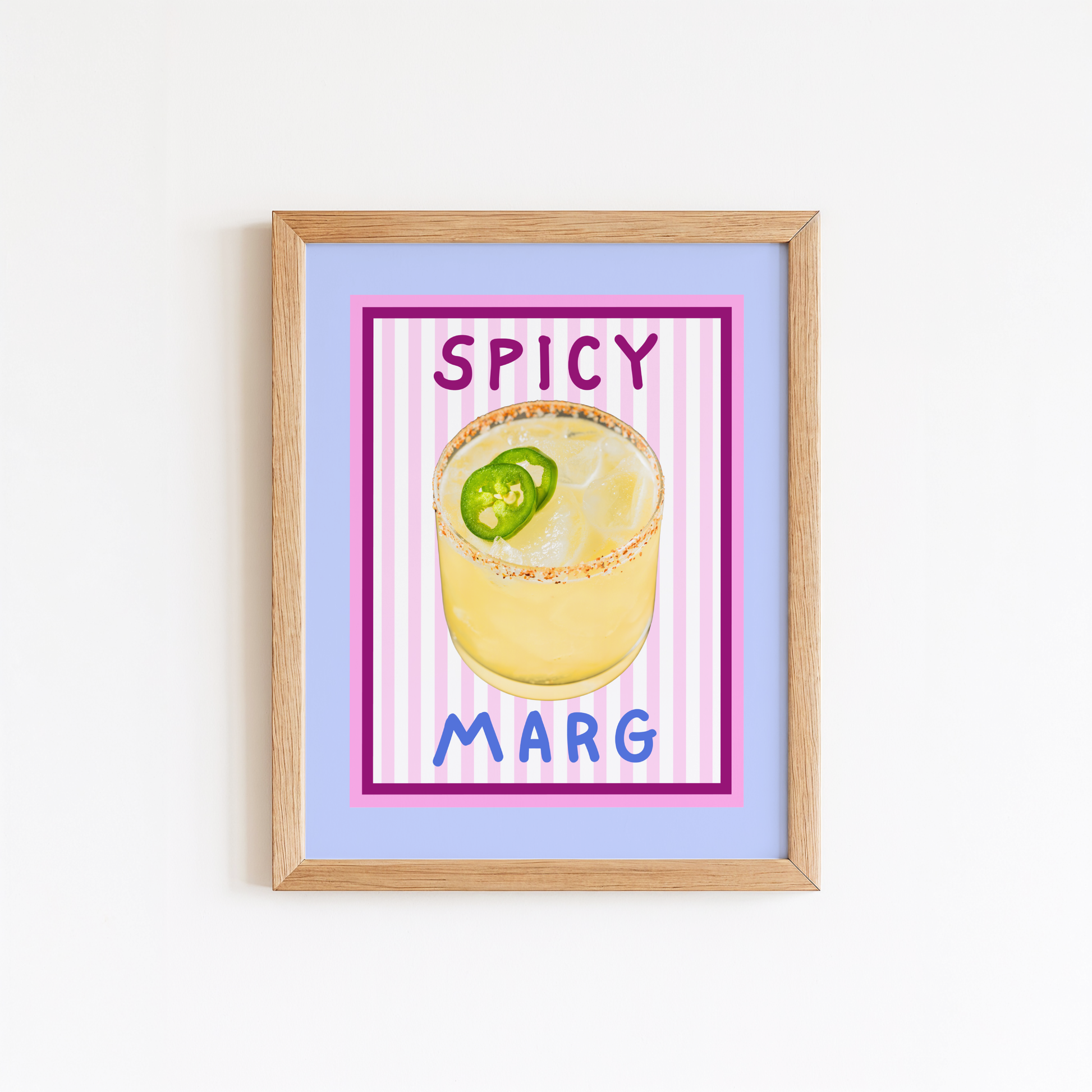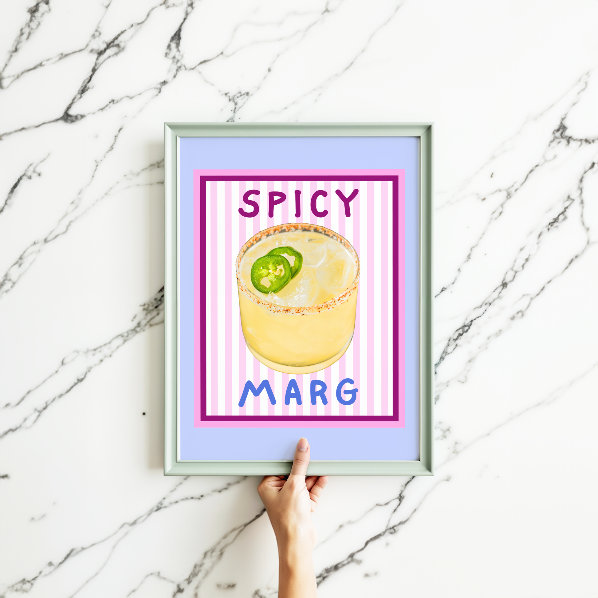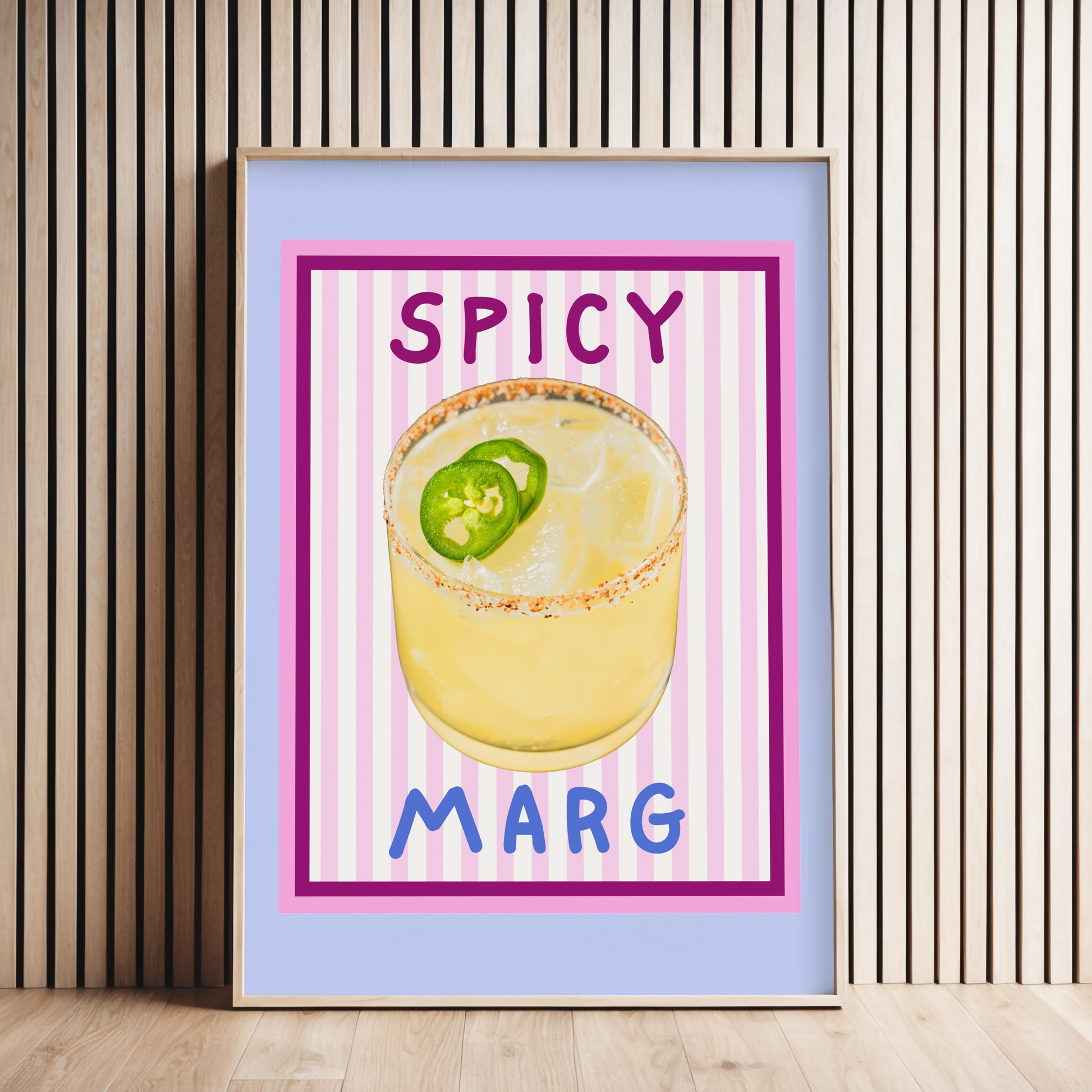 Turn up the heat with this bold and playful "Spicy Marg" poster print! This fun cocktail-themed design features a spicy margarita garnished with fresh jalapeño slices and a chilli-salt rim, set against a vibrant pink and white striped background. The words "SPICY" and "MARG" are written in chunky hand-drawn typography in deep magenta and blue, creating a funky contrast that makes the print pop.