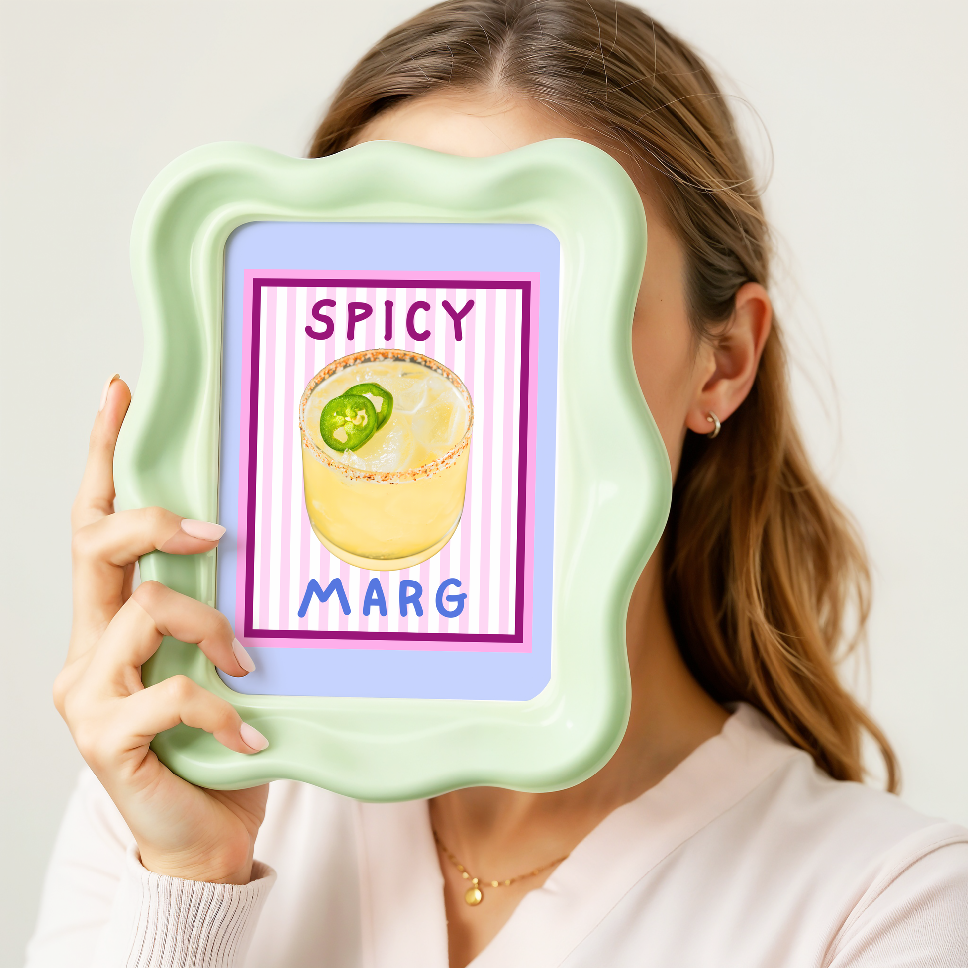 Framed with layered pink and magenta borders and set against a soft lilac background, this print adds a cheeky splash of personality to any kitchen, bar cart, dining area, or party space. It’s the perfect piece for margarita lovers, taco night hosts, or anyone who enjoys a spicy twist with their cocktails.