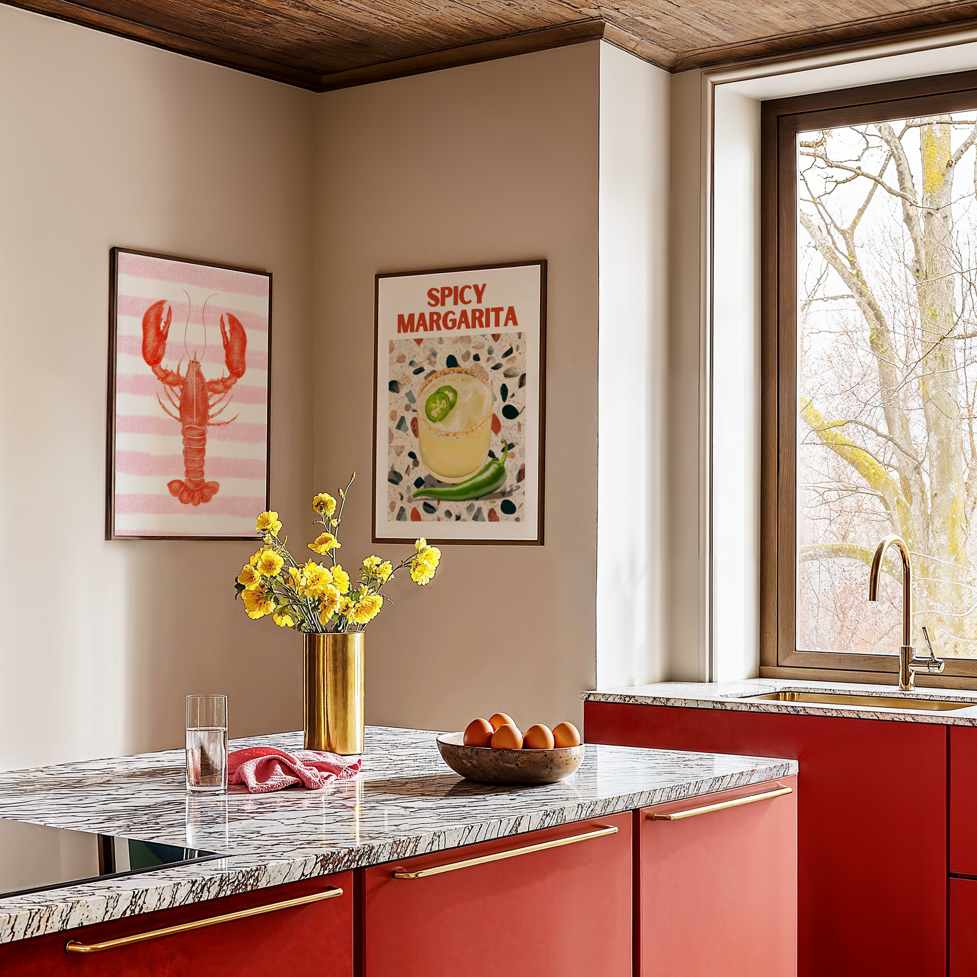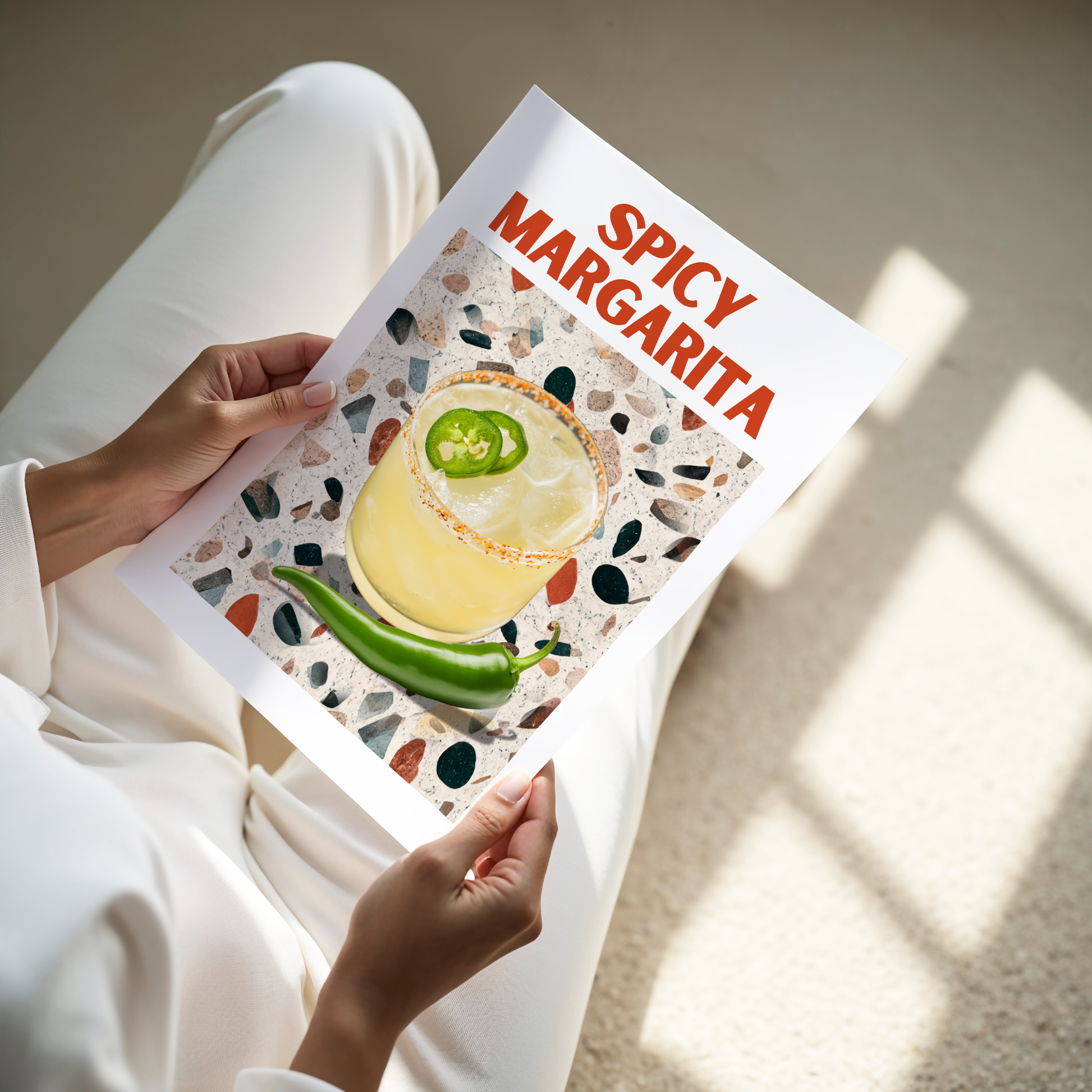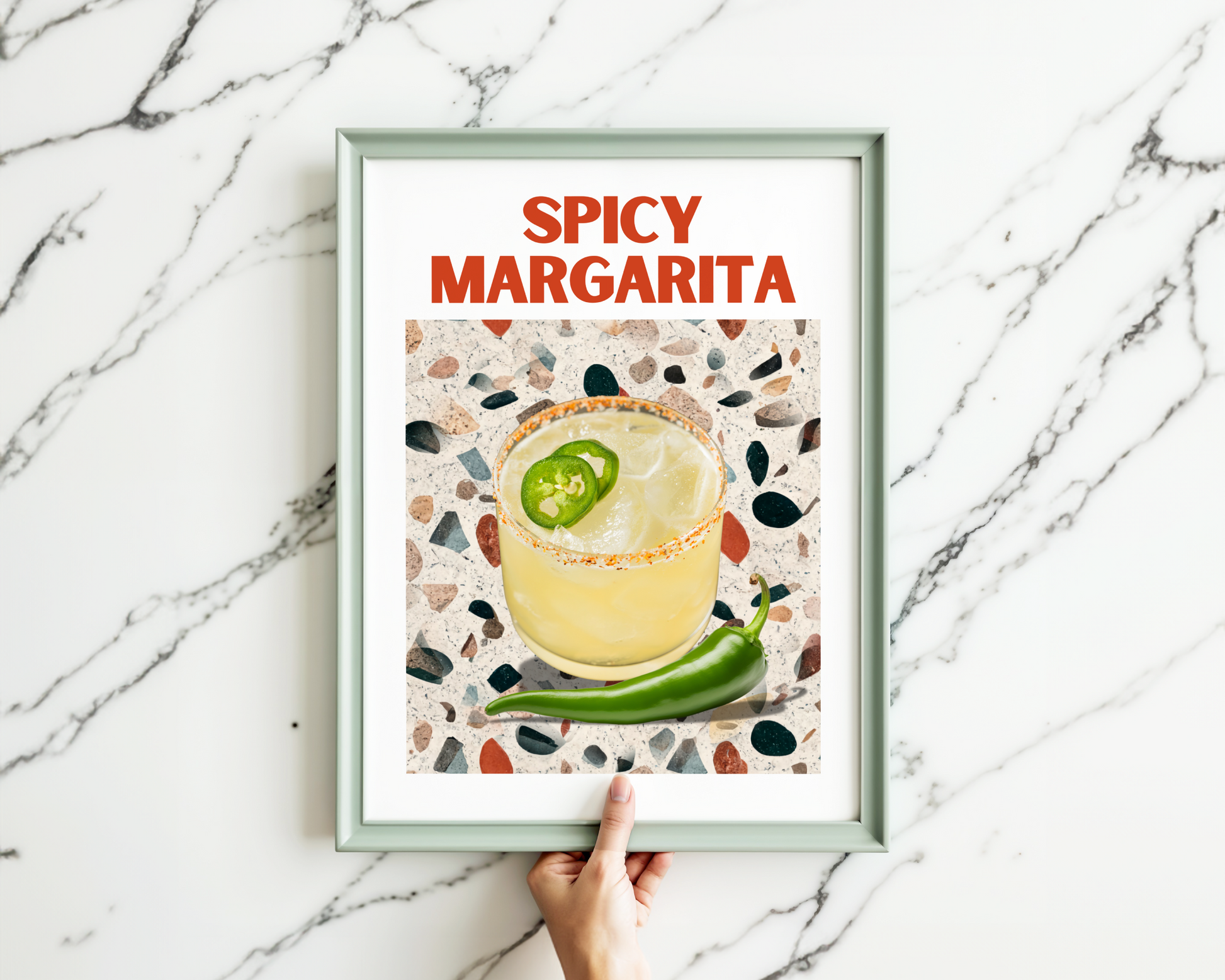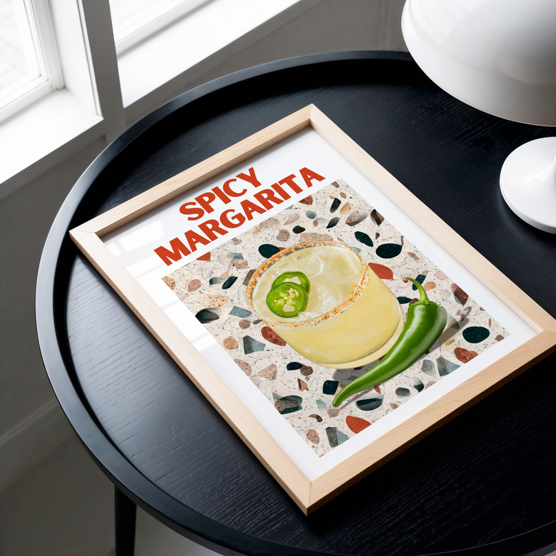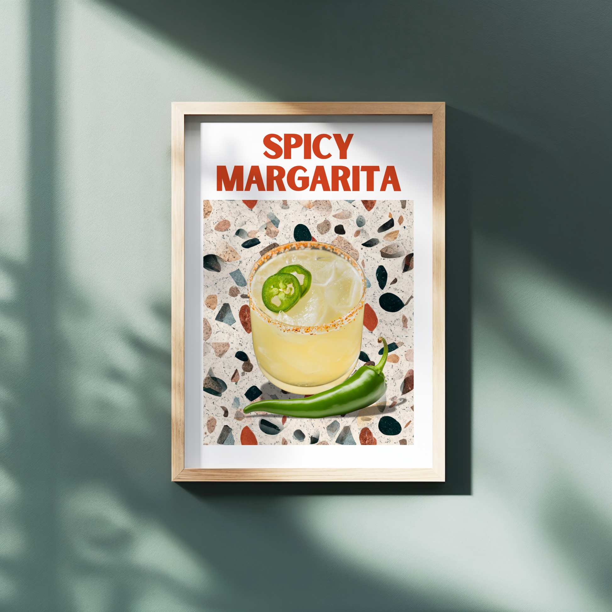 This poster print features a zesty margarita cocktail and a green chili on a trendy terrazzo table, with "Spicy Margarita" splashed in bold red typography. It’s a chic and eye-catching design straight out of the vibrant bars of New York, ready to spice up your walls!
