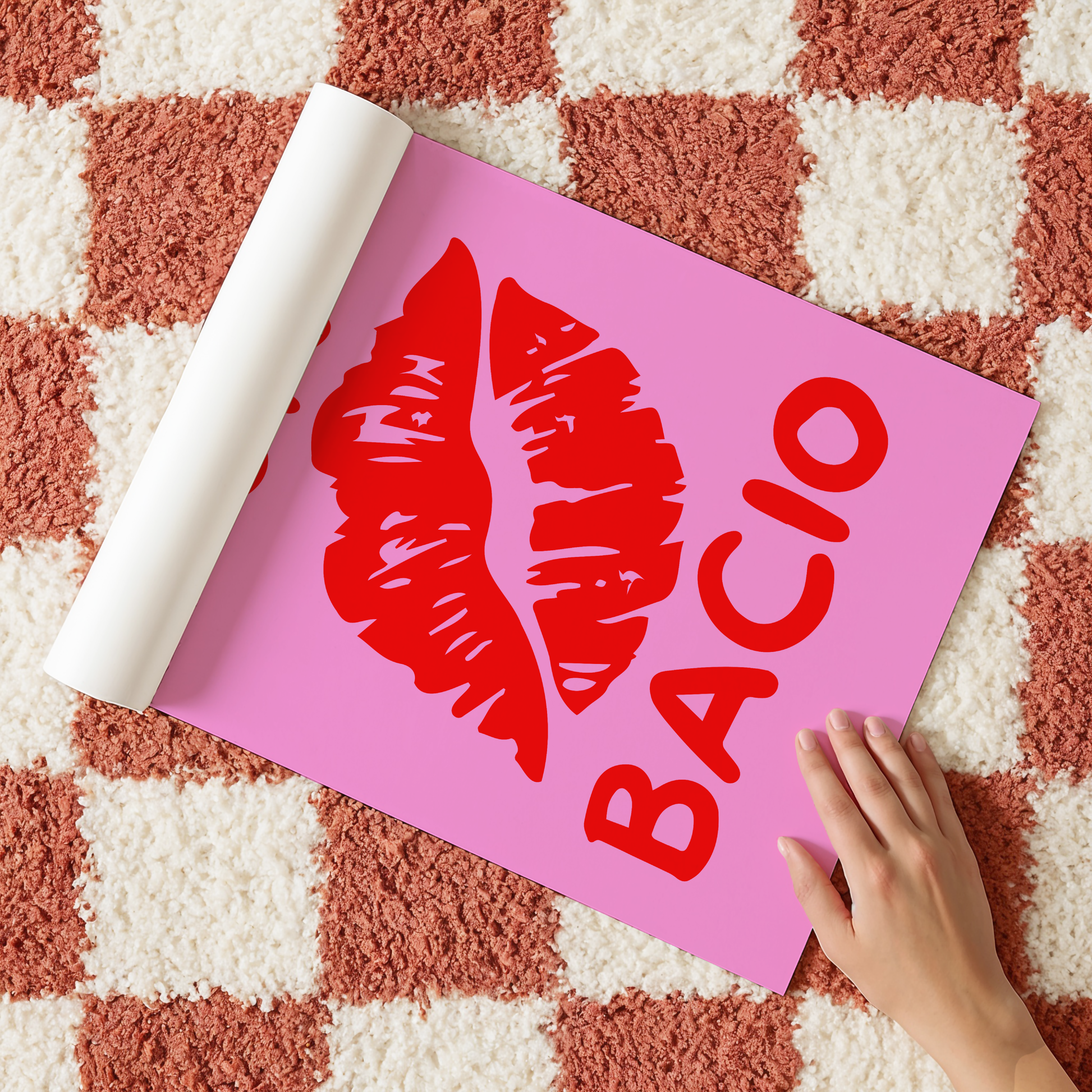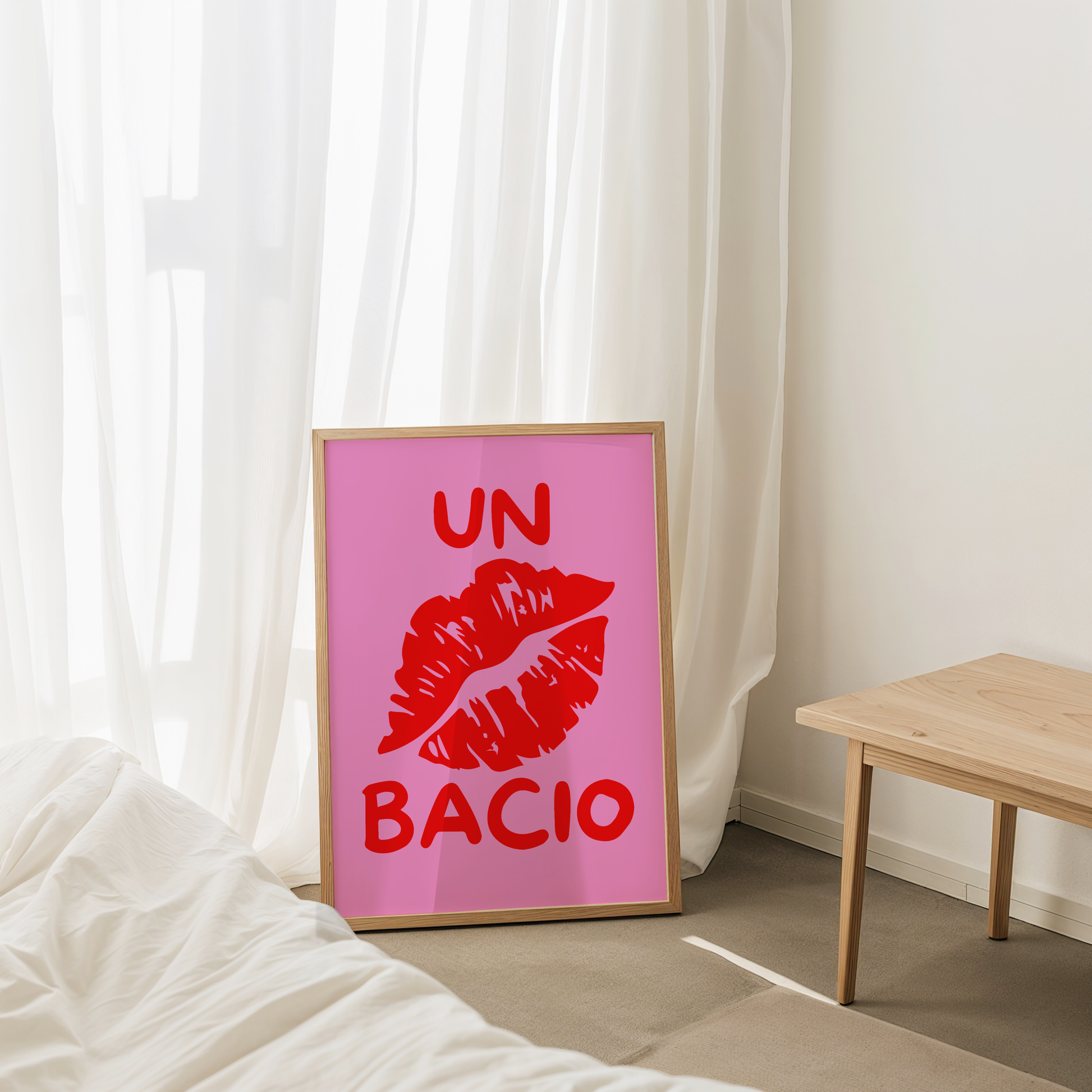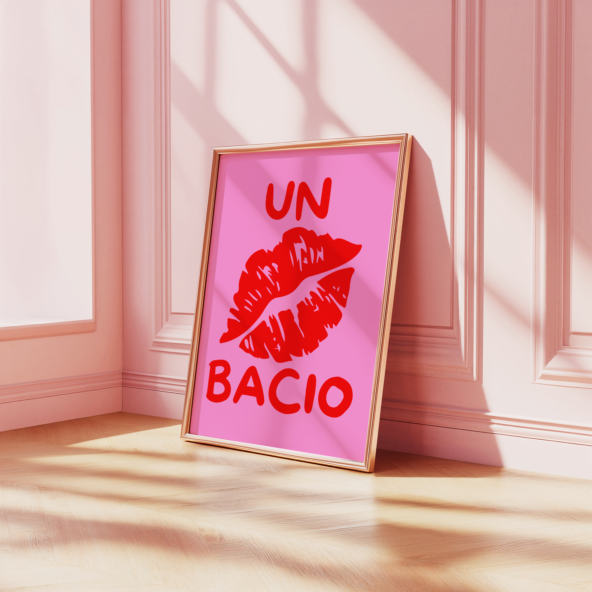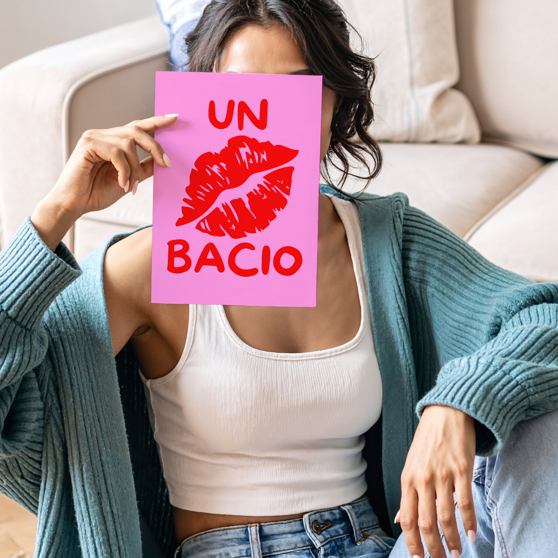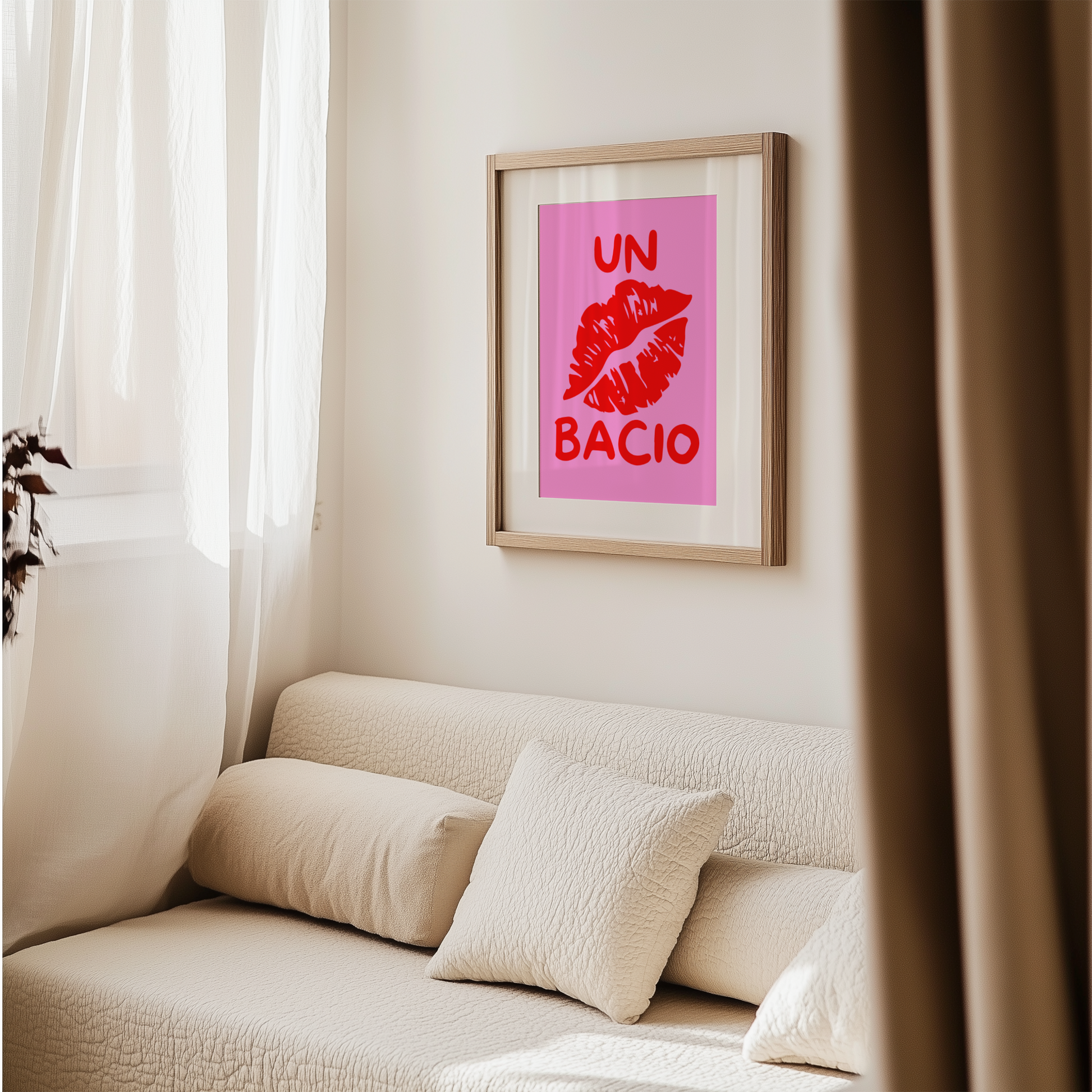 Pucker up for Un Bacio! This vibrant poster print features red painted lips and playful Italian typography that says 'a kiss'. With a bright pink background and vibrant red lettering, this design is perfect for adding a pop of glam to your vanity, walk-in robe or beauty salon.