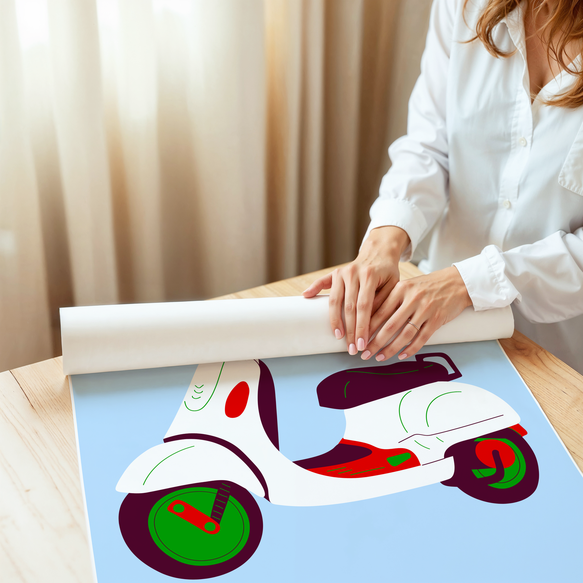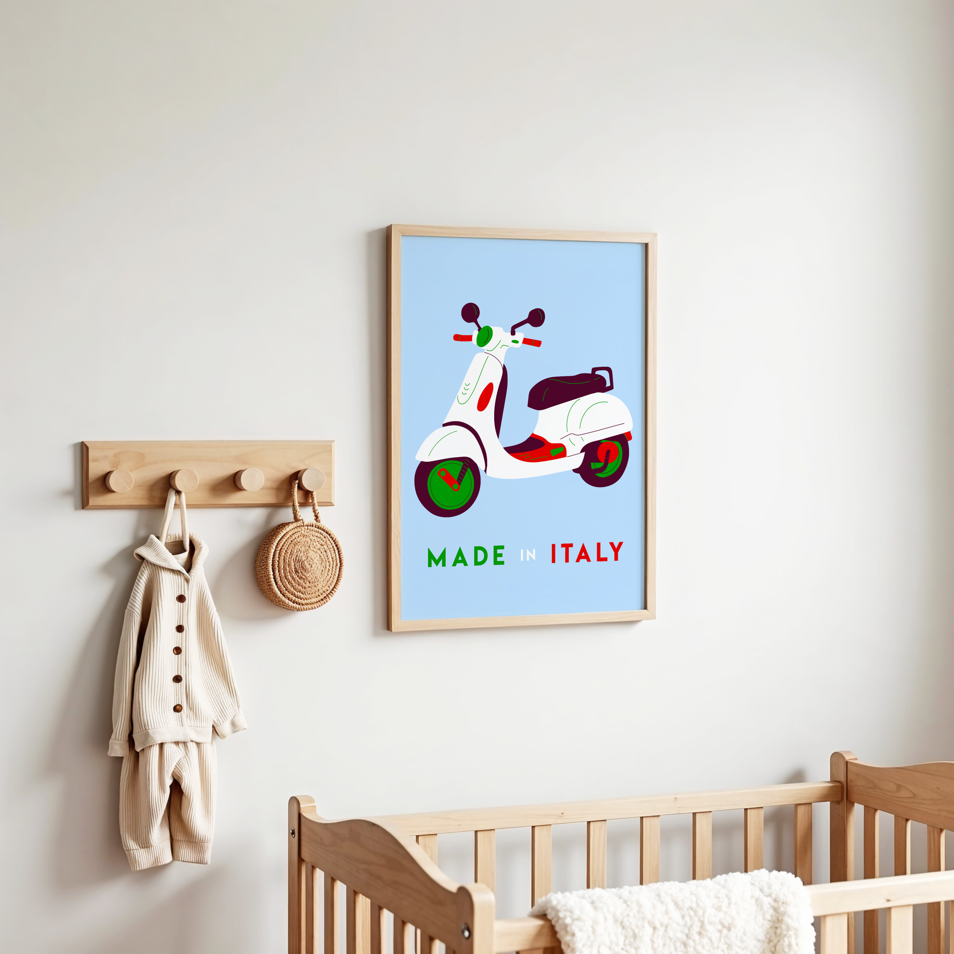 Infuse your walls with a splash of colour and a touch of retro Italy through this charming Vespa poster print. The design features a vespa on a blue background and the words 'Made In Italy' underneath. This wall art is also an endearing addition to a child's bedroom or play space.