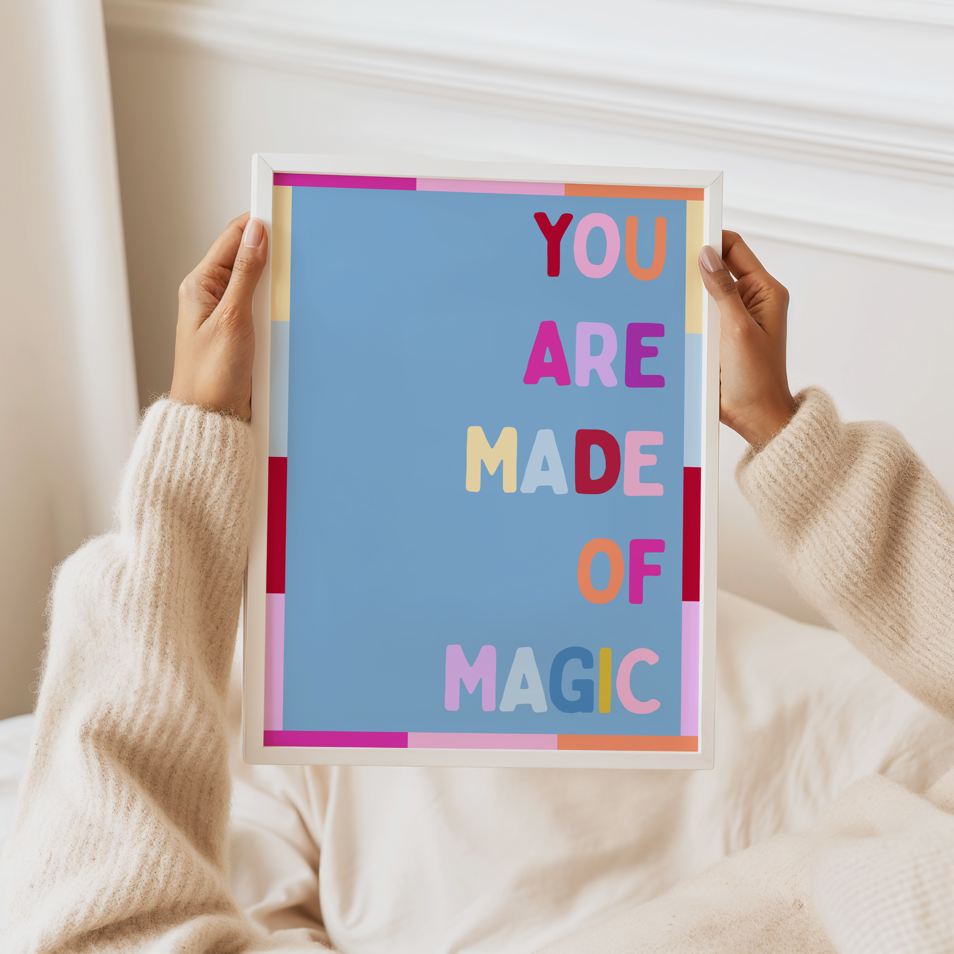 Bring joy, positivity, and colour into your home with this uplifting wall art print. Featuring the inspiring hand-lettered quote “You Are Made of Magic” in a rainbow palette on a soft blue background, this artwork makes a playful yet meaningful addition to any space.